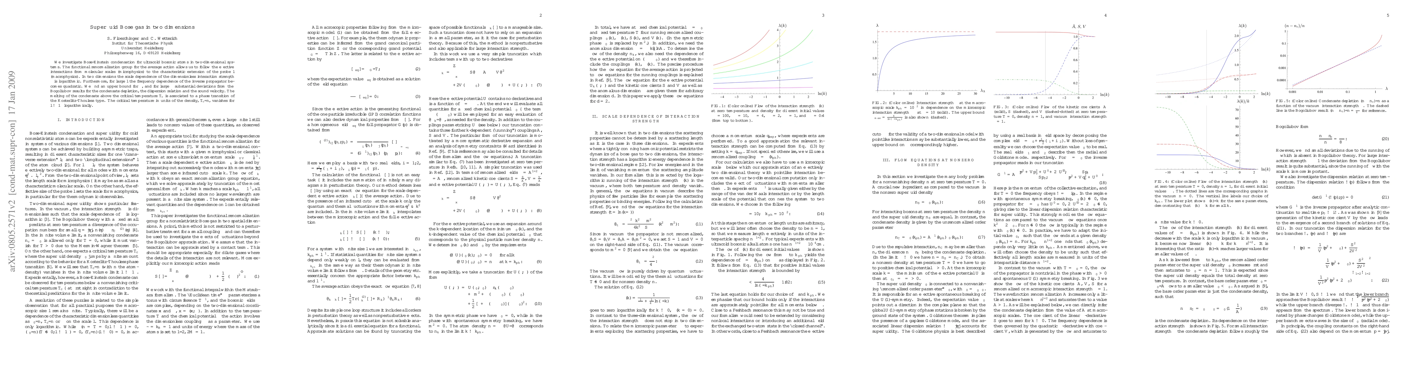 We investigate Bose-Einstein condensation for ultracold bosonic atoms in two-dimensional systems. The functional renormalization group for the average action allows us to follow the effective interactions from molecular scales (microphysics) to the characteristic extension of the probe $l$ (macrophysics). In two dimensions the scale dependence of the dimensionless interaction strength $\lambda$ is logarithmic. Furthermore, for large $l$ the frequency dependence of the inverse propagator becomes quadratic. We find an upper bound for $\lambda$, and for large $\lambda$ substantial deviations from the Bogoliubov results for the condensate depletion, the dispersion relation and the sound velocity. The melting of the condensate above the critical temperature $T_c$ is associated to a phase transition of the Kosterlitz-Thouless type. The critical temperature in units of the density, $T_c/n$, vanishes for $l\to\infty$ logarithmically.