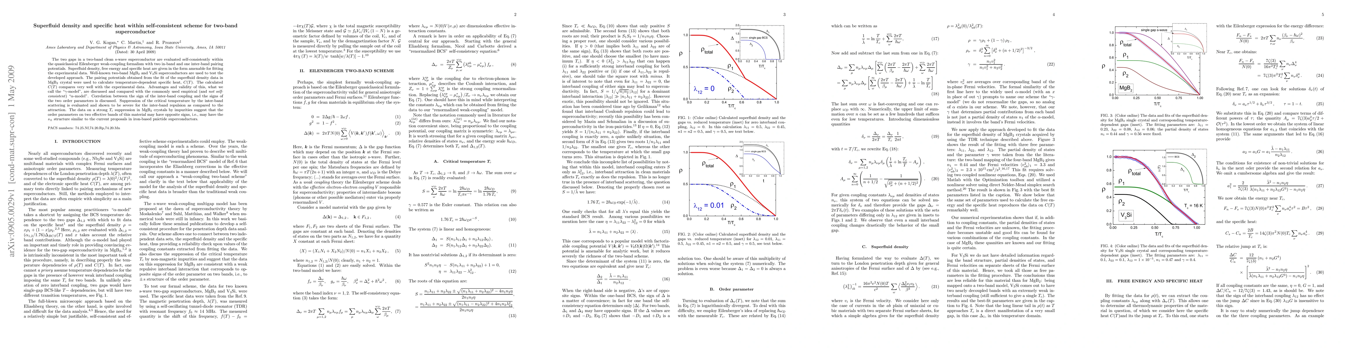 The two gaps in a two-band clean s-wave superconductor are evaluated self-consistently within the quasiclassical Eilenberger weak-coupling formalism with two in-band and one inter-band pairing potentials. Superfluid density, free energy and specific heat are given in the form amenable for fitting the experimental data. Well-known two-band MgB$_2$ and V$_3$Si superconductors are used to test the developed approach. The pairing potentials obtained from the fit of the superfluid density data in MgB$_2$ crystal were used to calculate temperature-dependent specific heat, $C(T)$. The calculated $C(T)$ compares very well with the experimental data. Advantages and validity of this, what we call the "$\gamma$-model", are discussed and compared with the commonly used empirical (and \textit{not self-consistent}) "$\alpha$-model". Correlation between the sign of the inter-band coupling and the signs of the two order parameters is discussed. Suppression of the critical temperature by the inter-band scattering is evaluated and shown to be severe for the inter-band repulsion as compared to the attraction. The data on a strong $T_c$ suppression in MgB$_2$ crystals by impurities suggest that the order parameters on two effective bands of this material may have opposite signs, i.e., may have the $s_{\pm}$ structure similar to the current proposals in iron-based pnictide superconductors.
