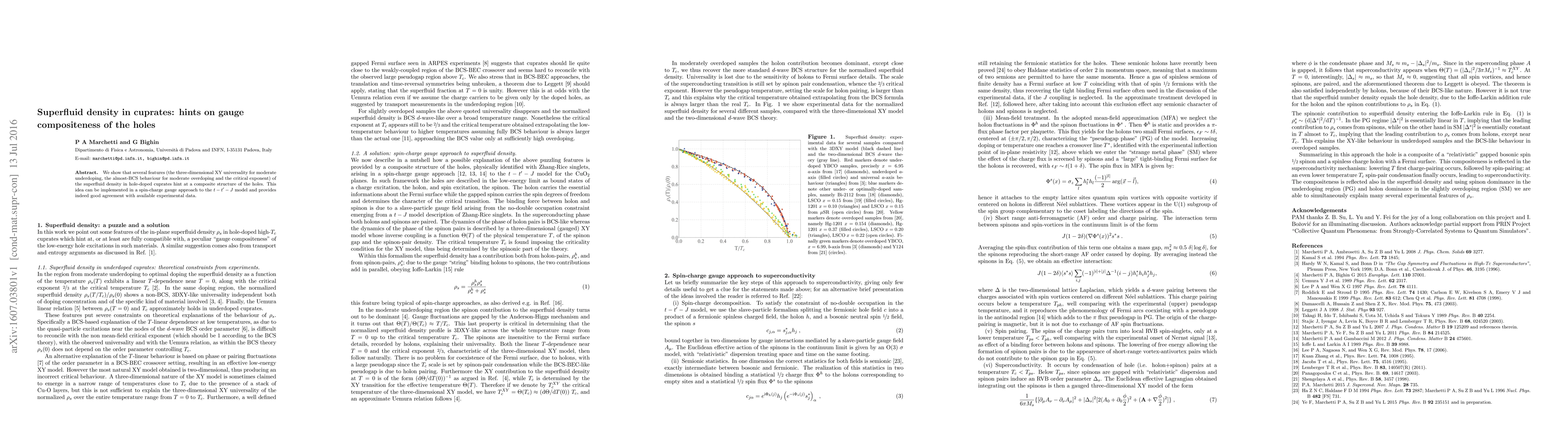 We show that several features (the three-dimensional XY universality for moderate underdoping, the almost-BCS behaviour for moderate overdoping and the critical exponent) of the superfluid density in hole-doped cuprates hint at a composite structure of the holes. This idea can be implemented in a spin-charge gauge approach to the $t - t' - J$ model and provides indeed good agreement with available experimental data.