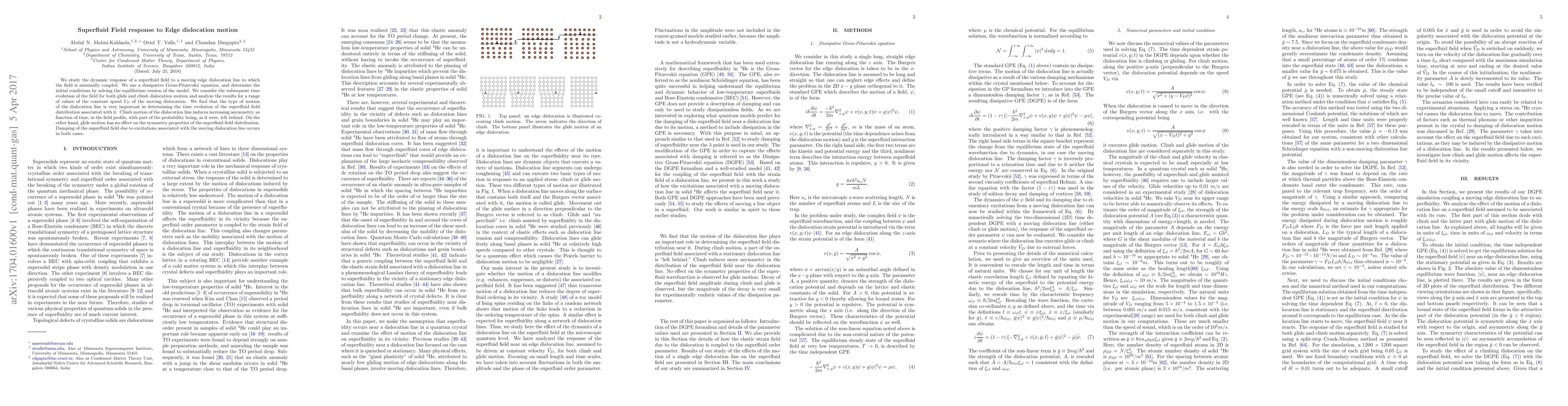 This paper investigates the dynamic response of a superfluid field to the motion of an edge dislocation, finding that glide and climb motions produce distinct effects on the field's distribution. Climb motion induces asymmetry and "left-behind" probability, while glide motion preserves symmetry; both motions cause damping of the superfluid field.