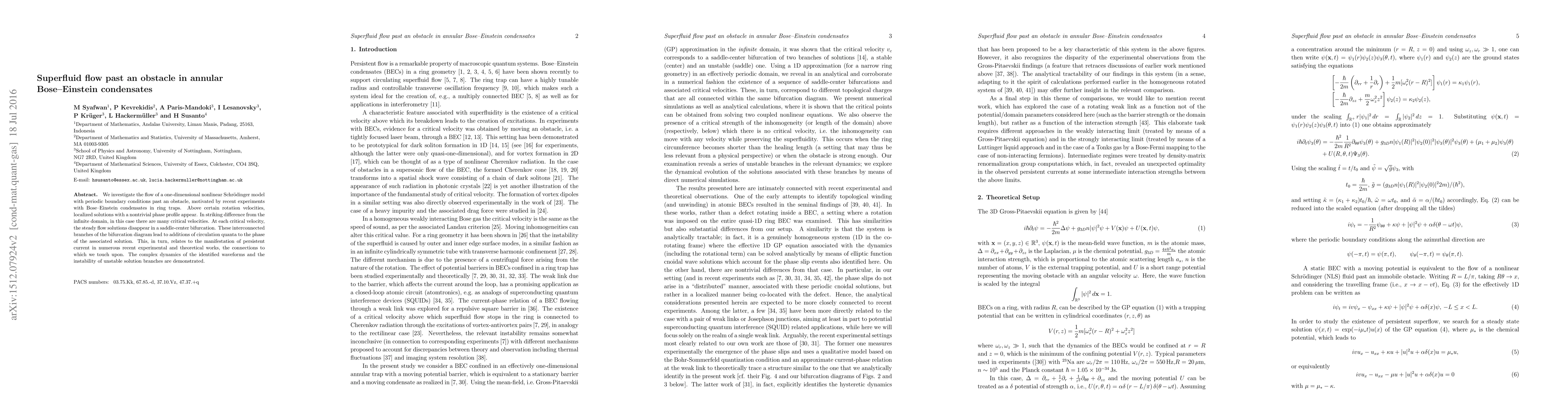 This paper studies the superfluid flow of Bose-Einstein condensates in a ring past an obstacle, revealing multiple critical velocities where localized solutions emerge. The bifurcations at these velocities lead to persistent current and circulation quanta, highlighting complex dynamics and instabilities in the flow.