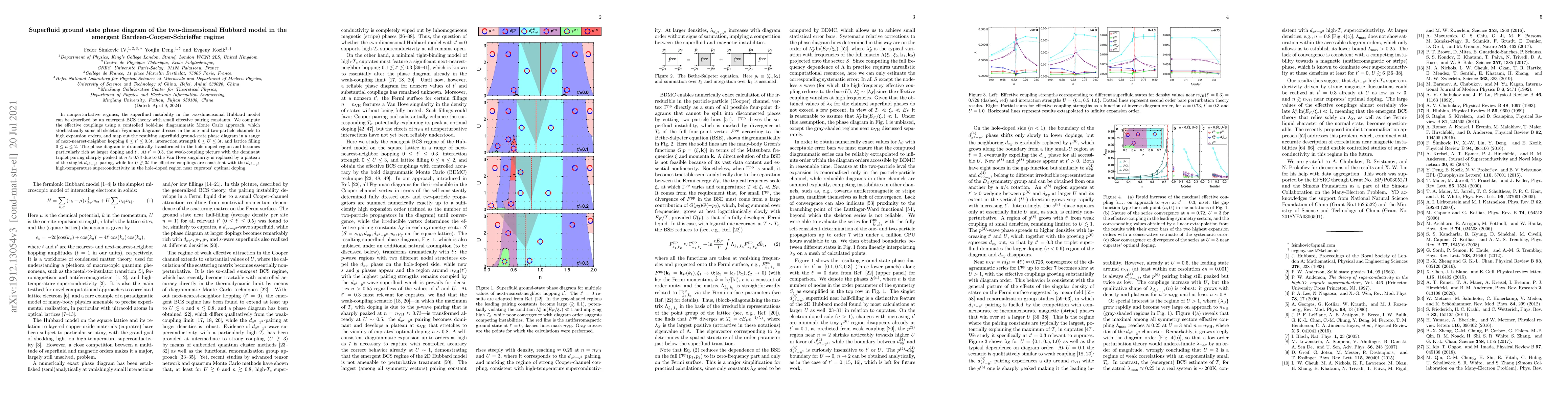 In nonperturbative regimes, the superfluid instability in the two-dimensional Hubbard model can be described by an emergent BCS theory with small effective pairing constants. We compute the effective couplings using a controlled bold-line diagrammatic Monte Carlo approach, which stochastically sums all skeleton Feynman diagrams dressed in the one- and two-particle channels to high expansion orders, and map out the resulting superfluid ground-state phase diagram in a range of next-nearest-neighbor hopping $0 \leq t^{\prime} \leq 0.3t$, interaction strength $0 \leq U \leq 3t$, and lattice filling $0 \leq n \leq 2$. The phase diagram is dramatically transformed in the hole-doped region and becomes particularly rich at larger doping and $t'$. At $t'=0.3$, the weak-coupling picture with the dominant triplet pairing sharply peaked at $n \approx 0.73$ due to the Van Hove singularity is replaced by a plateau of the singlet $d_{x^2-y^2}$ paring, while for $U \gtrsim 3t$ the effective couplings are consistent with the $d_{x^2-y^2}$ high-temperature superconductivity in the hole-doped region near cuprates' optimal doping.