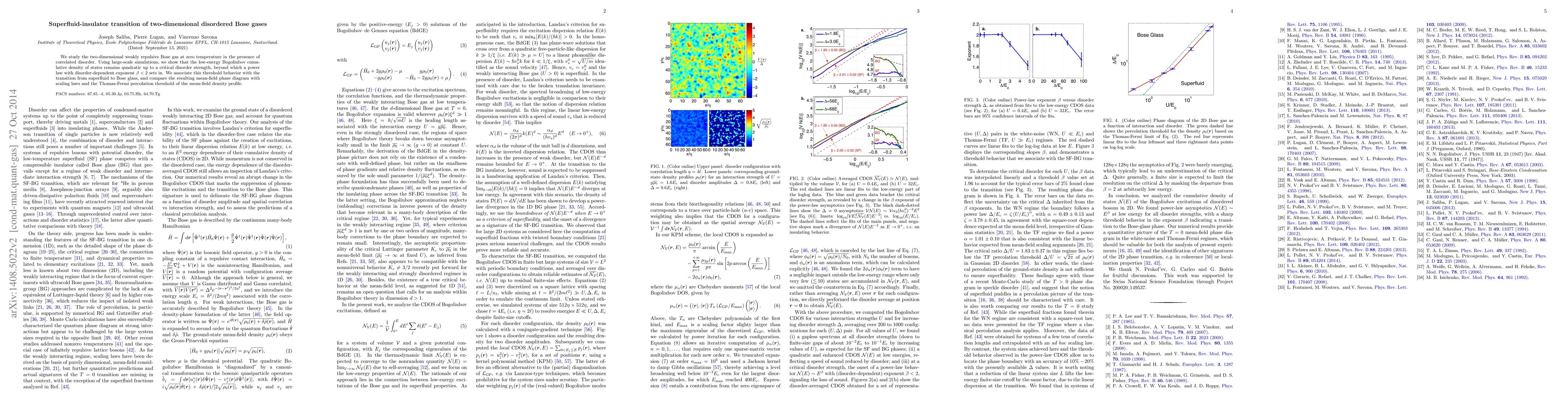 This paper investigates the superfluid-insulator transition in two-dimensional disordered Bose gases, demonstrating that a critical disorder strength leads to a change in the low-energy density of states from quadratic to a power law, marking the transition from superfluid to Bose glass. The study compares the phase diagram to scaling laws and the Thomas-Fermi percolation threshold.