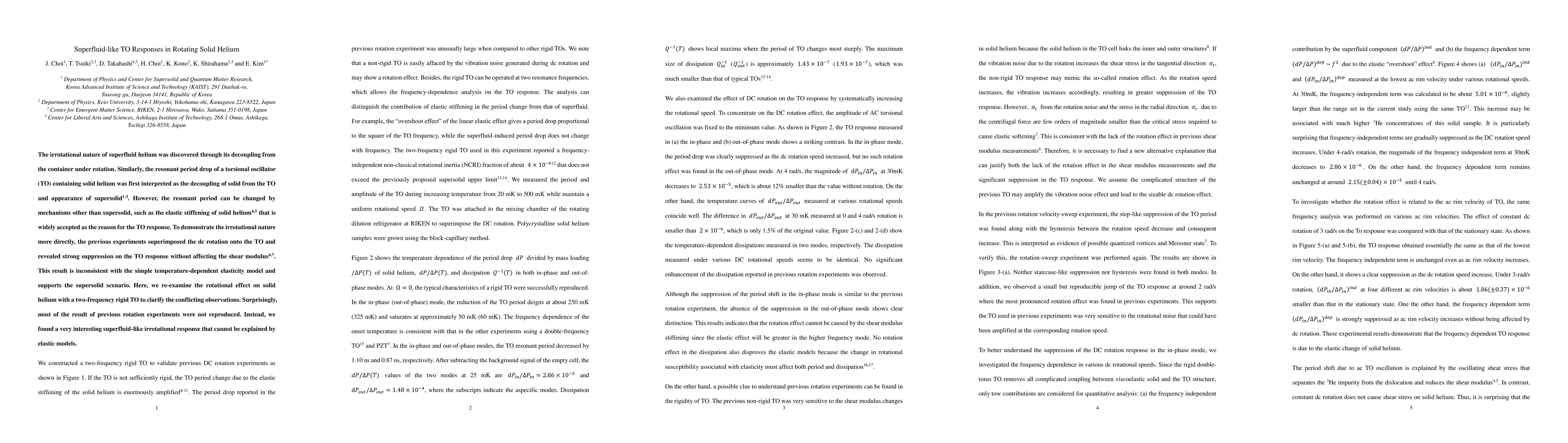 The irrotational nature of superfluid helium was discovered through its decoupling from the container under rotation. Similarly, the resonant period drop of a torsional oscillator (TO) containing solid helium was first interpreted as the decoupling of solid from the TO and appearance of supersolid. However, the resonant period can be changed by mechanisms other than supersolid, such as the elastic stiffening of solid helium that is widely accepted as the reason for the TO response. To demonstrate the irrotational nature more directly, the previous experiments superimposed the dc rotation onto the TO and revealed strong suppression on the TO response without affecting the shear modulus. This result is inconsistent with the simple temperature-dependent elasticity model and supports the supersolid scenario. Here, we re-examine the rotational effect on solid helium with a two-frequency rigid TO to clarify the conflicting observations. Surprisingly, most of the result of previous rotation experiments were not reproduced. Instead, we found a very interesting superfluid-like irrotational response that cannot be explained by elastic models.