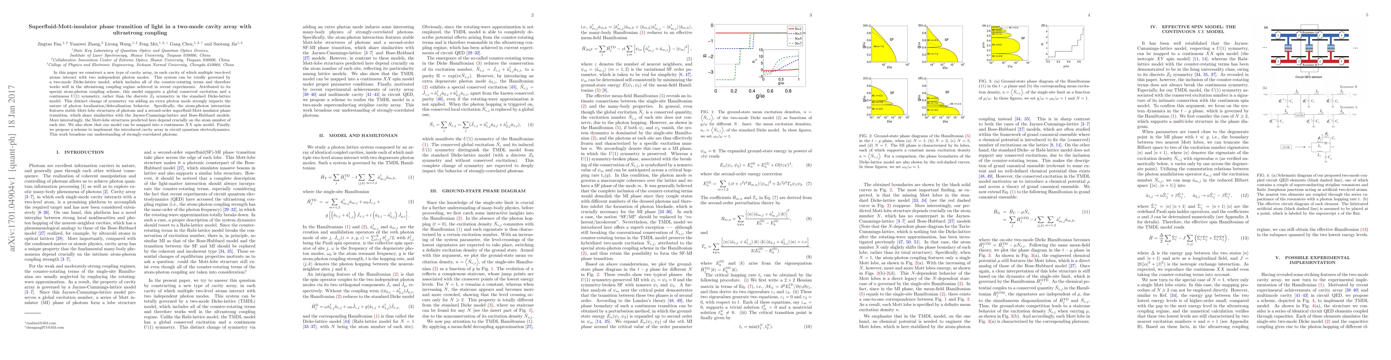 This paper explores a novel cavity array where multiple two-level atoms interact with two photon modes, leading to an ultrastrong coupling regime. The system exhibits a superfluid-Mott-insulator phase transition and stable Mott-lobe structures, differing from the standard Dicke-lattice model due to its continuous $U(1)$ symmetry and dependence on atom number per site.
