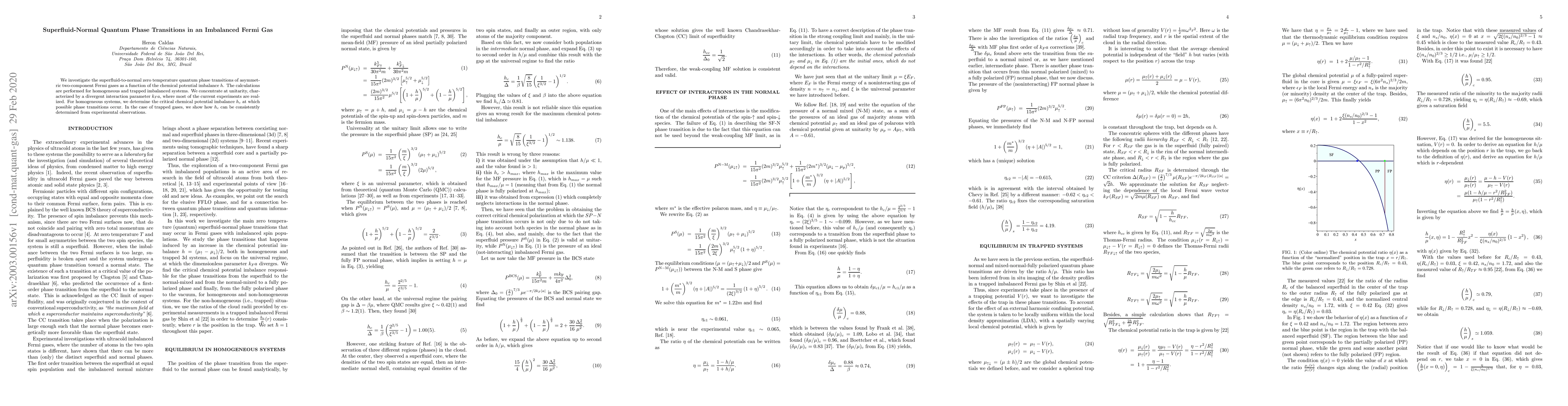 This paper studies the superfluid-to-normal quantum phase transition in asymmetric Fermi gases under varying chemical potential imbalance $h$, focusing on unitarity. It determines the critical imbalance $h_c$ for both homogeneous and trapped systems, providing insights for experimental observations.