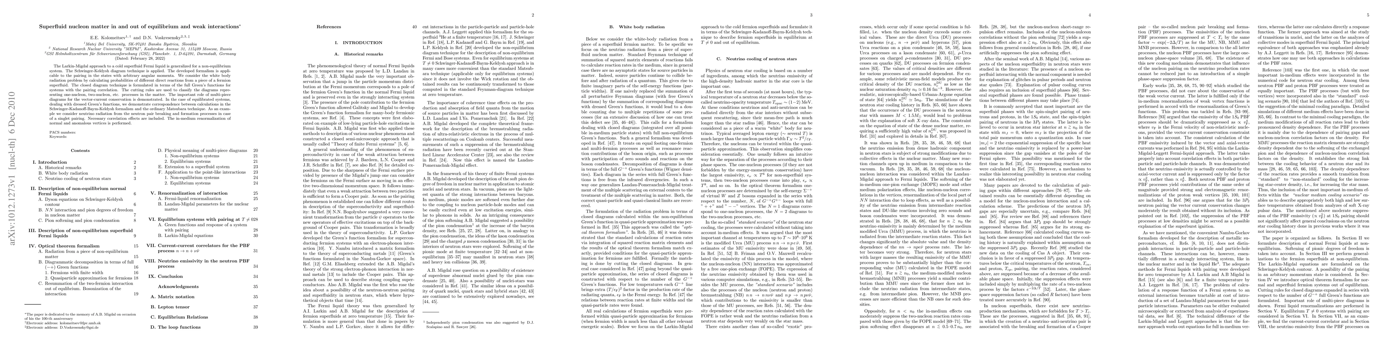 The Larkin-Migdal approach to a cold superfluid Fermi liquid is generalized for a non-equilibrium system. The Schwinger-Keldysh diagram technique is applied. The developed formalism is applicable to the pairing in the states with arbitrary angular momenta. We consider the white body radiation problem by calculating probabilities of different direct reactions from a piece of a fermion superfluid. The closed diagram technique is formulated in terms of the full Green's functions for systems with the pairing correlation. The cutting rules are used to classify the diagrams representing one-nucleon, two-nucleon, etc. processes in the matter. The important role of multi-piece diagrams for the vector-current conservation is demonstrated. In the case of equilibrated systems, dealing with dressed Green's functions, we demonstrate correspondence between calculations in the Schwinger-Kadanoff-Baym-Keldysh formalism and the ordinary Matsubara technique. As an example we consider neutrino radiation from the neutron pair breaking and formation processes in case of a singlet pairing. Necessary correlation effects are included. The in-medium renormalization of normal and anomalous vertices is performed.