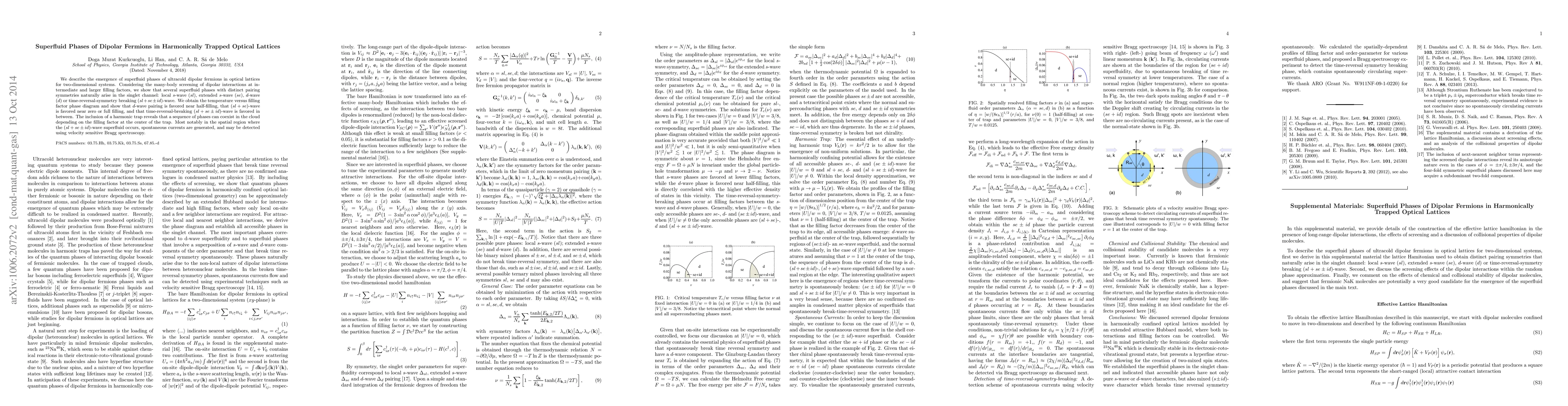 This paper explores superfluid phases in two-dimensional dipolar fermion systems within optical lattices, revealing multiple pairing symmetries including s-wave, d-wave, and time-reversal-breaking phases. The study finds that different pairing types are favored at various filling factors, with spontaneous currents detectable in certain regions.