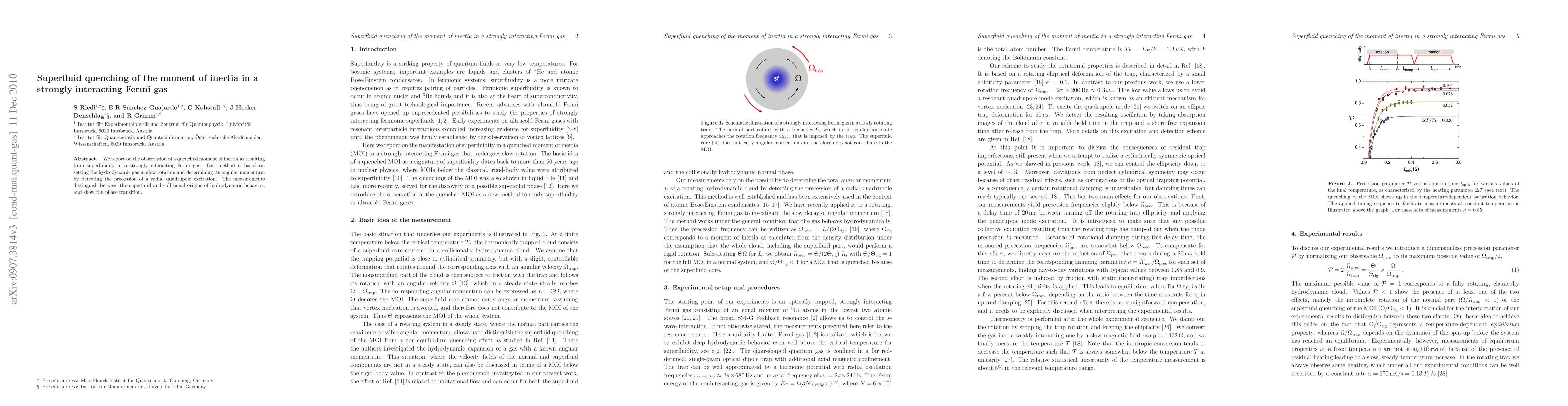 This research observes a quenched moment of inertia in a strongly interacting Fermi gas due to superfluidity, achieved by rotating the gas slowly and measuring angular momentum via radial quadrupole excitation precession. The findings distinguish between superfluid and collisional origins of hydrodynamic behavior, highlighting the phase transition.