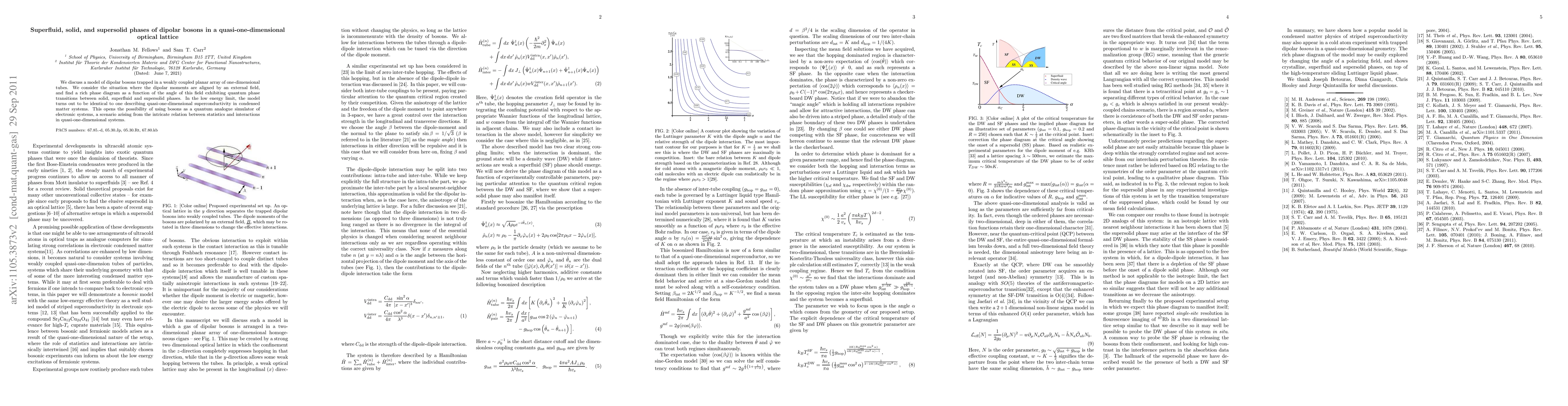 We discuss a model of dipolar bosons trapped in a weakly coupled planar array of one-dimensional tubes. We consider the situation where the dipolar moments are aligned by an external field, and find a rich phase diagram as a function of the angle of this field exhibiting quantum phase transitions between solid, superfluid and supersolid phases. In the low energy limit, the model turns out to be identical to one describing quasi-one-dimensional superconductivity in condensed matter systems. This opens the possibility of using bosons as a quantum analogue simulator of electronic systems, a scenario arising from the intricate relation between statistics and interactions in quasi-one-dimensional systems.