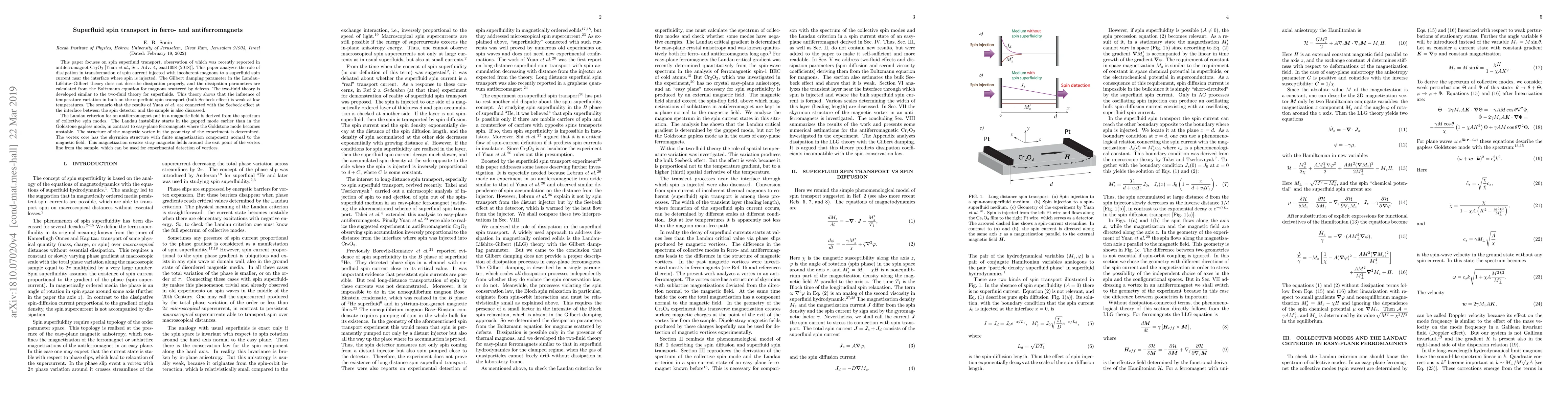 This paper investigates superfluid spin transport in ferro- and antiferromagnets, focusing on the transformation of incoherent spin current into superfluid spin current near the interface. It develops a two-fluid theory for spin superfluids and discusses the weak influence of temperature variation on superfluid transport at low temperatures.