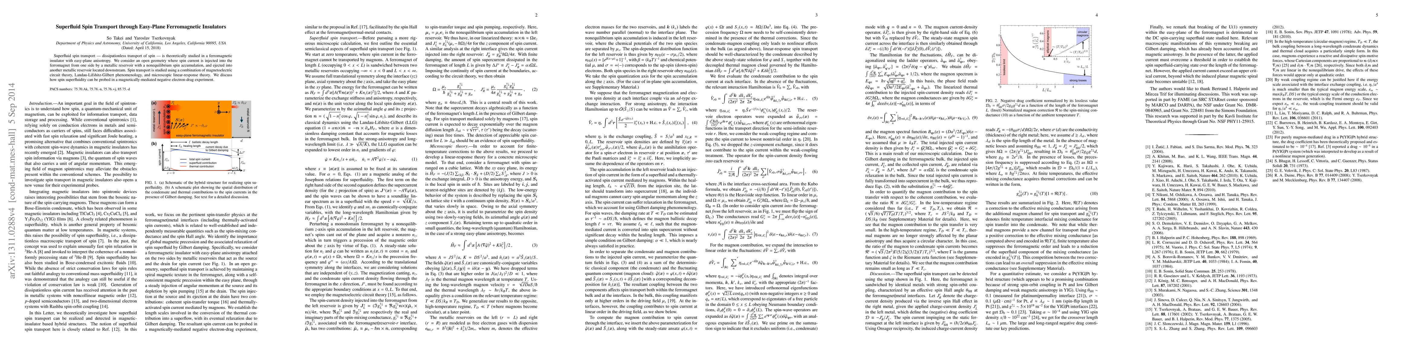 This paper investigates superfluid spin transport in easy-plane ferromagnetic insulators using magnetoelectric circuit theory and linear-response theory. The study proposes a magnetically-mediated electron-drag experiment to probe spin superfluidity, highlighting dissipationless spin current transport.