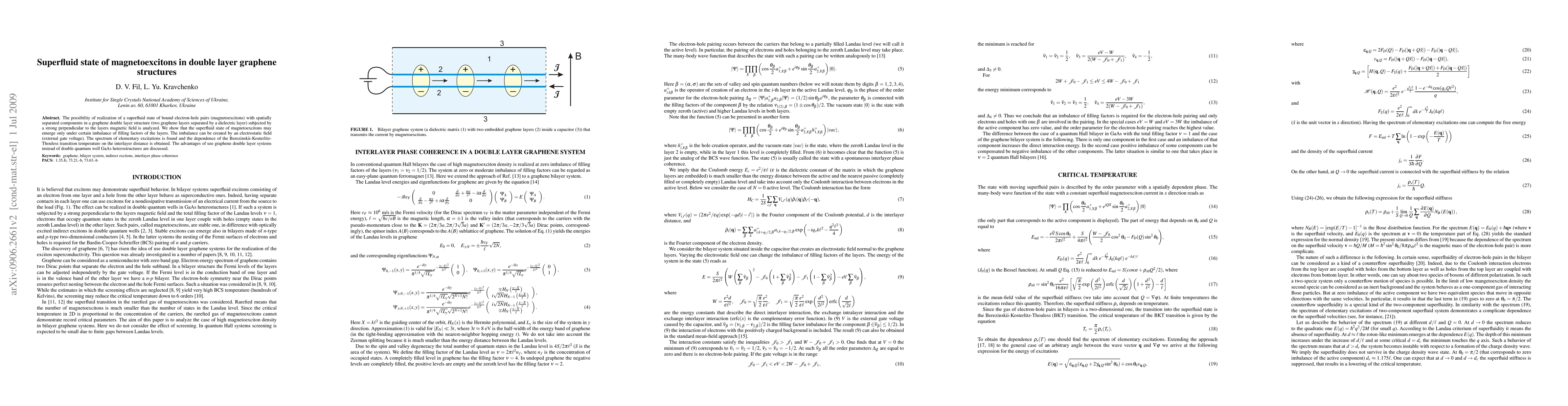 This paper investigates the superfluid state of magnetoexcitons in double layer graphene structures under strong magnetic fields, revealing that such a state emerges only with specific filling factor imbalances created by external gate voltages. The study also determines the spectrum of elementary excitations and the Berezinskii-Kosterlitz-Thouless transition temperature, highlighting the benefits of graphene systems over GaAs heterostructures.