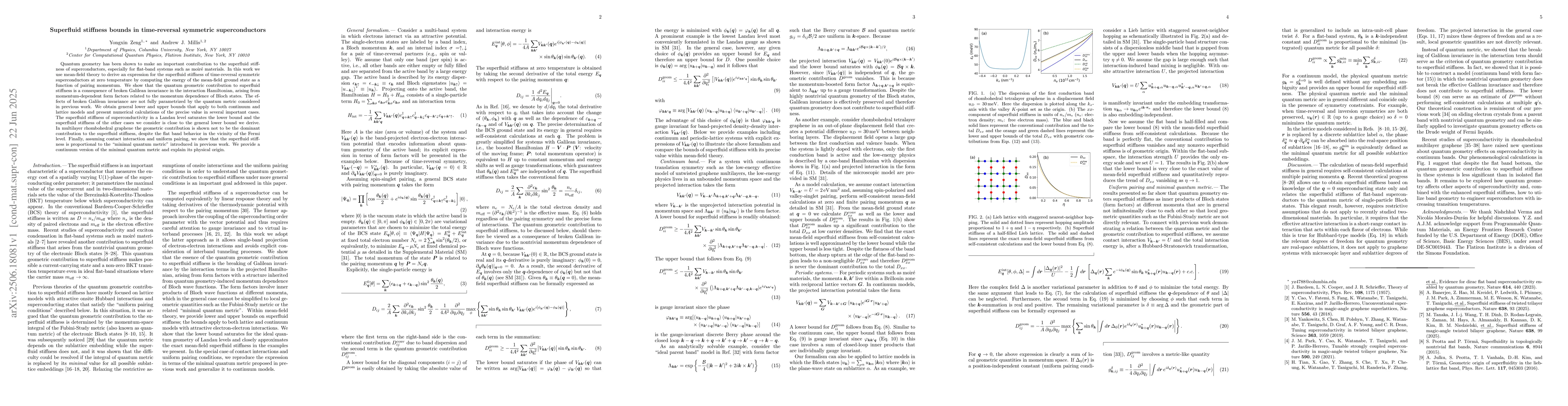The paper presents a formalism for calculating superfluid stiffness in time-reversal symmetric superconductors, incorporating both conventional and geometric contributions, and derives general bounds applicable to various models.
