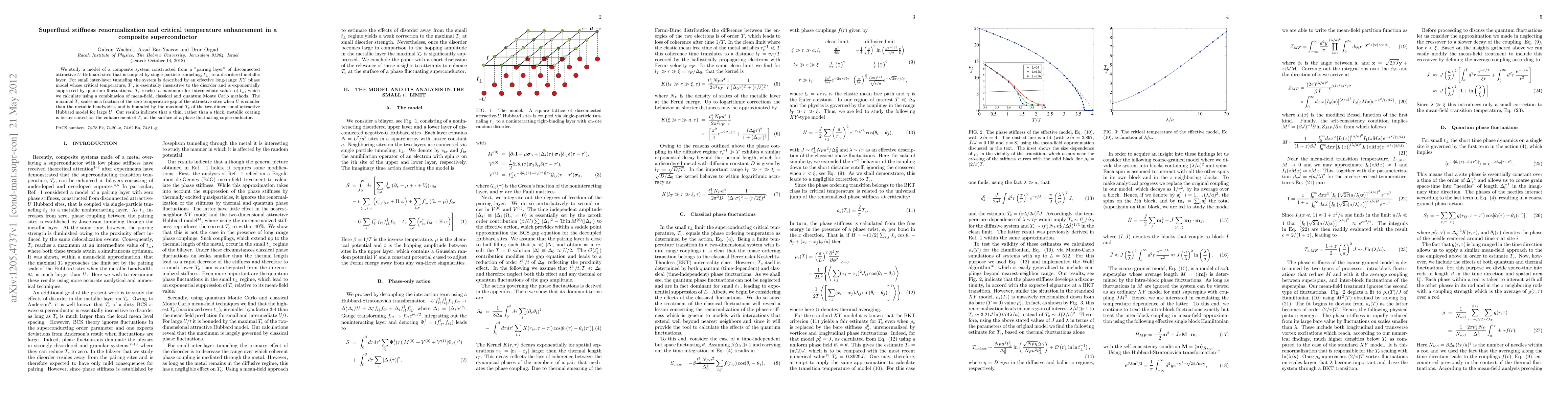 We study a model of a composite system constructed from a "pairing layer" of disconnected attractive-U Hubbard sites that is coupled by single-particle tunneling, t_perp, to a disordered metallic layer. For small inter-layer tunneling the system is described by an effective long-range XY phase model whose critical temperature, T_c, is essentially insensitive to the disorder and is exponentially suppressed by quantum fluctuations. T_c reaches a maximum for intermediate values of t_perp, which we calculate using a combination of mean-field, classical and quantum Monte Carlo methods. The maximal T_c scales as a fraction of the zero temperature gap of the attractive sites when U is smaller than the metallic bandwidth, and is bounded by the maximal T_c of the two-dimensional attractive Hubbard model for large U. Our results indicate that a thin, rather than a thick, metallic coating is better suited for the enhancement of T_c at the surface of a phase fluctuating superconductor.