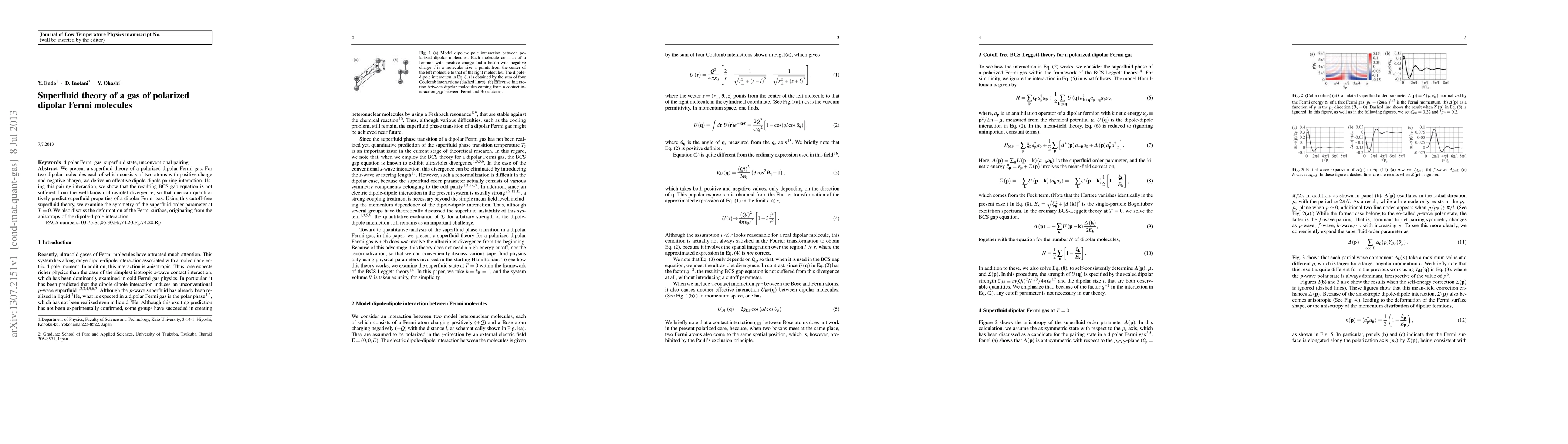 We present a superfluid theory of a polarized dipolar Fermi gas. For two dipolar molecules each of which consists of two atoms with positive charge and negative charge, we derive an effective dipole-dipole pairing interaction. Using this pairing interaction, we show that the resulting BCS gap equation is not suffered from the well-known ultraviolet divergence, so that one can quantitatively predict superfluid properties of a dipolar Fermi gas. Using this cutoff-free superfluid theory, we examine the symmetry of the superfluid order parameter at T=0. We also discuss the deformation of the Fermi surface, originating from the anisotropy of the dipole-dipole interaction.