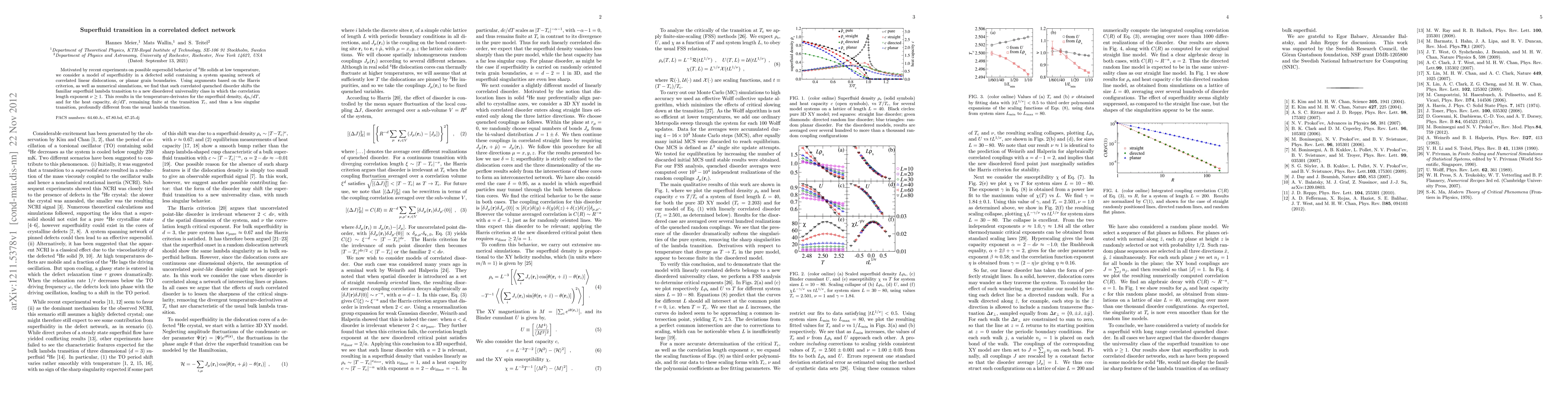 Motivated by recent experiments on possible supersolid behavior of $^4$He solids at low temperature, we consider a model of superfluidity in a defected solid containing a system spaning network of correlated linear dislocations, or planar grain boundaries. Using arguments based on the Harris criterion, as well as numerical simulations, we find that such correlated quenched disorder shifts the familiar superfluid lambda transition to a new disordered universality class in which the correlation length exponent $\nu\ge 1$. This results in the temperature-derivates for the superfluid density, $d\rho_{\rm s}/dT$, and for the heat capacity, $dc/dT$, remaining finite at the transition $T_{\rm c}$, and thus a less singular transition, profoundly different from the usual lambda transition.