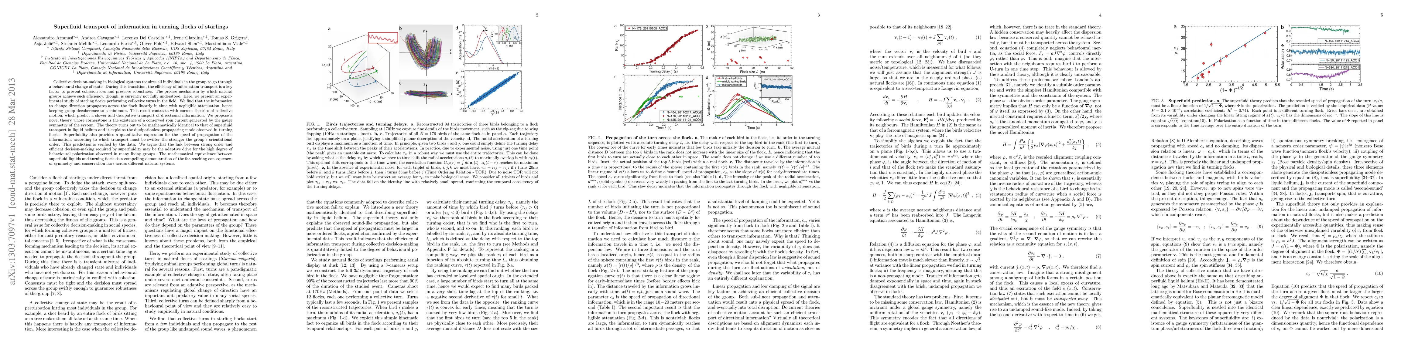Collective decision-making in biological systems requires all individuals in the group to go through a behavioural change of state. During this transition, the efficiency of information transport is a key factor to prevent cohesion loss and preserve robustness. The precise mechanism by which natural groups achieve such efficiency, though, is currently not fully understood. Here, we present an experimental study of starling flocks performing collective turns in the field. We find that the information to change direction propagates across the flock linearly in time with negligible attenuation, hence keeping group decoherence to a minimum. This result contrasts with current theories of collective motion, which predict a slower and dissipative transport of directional information. We propose a novel theory whose cornerstone is the existence of a conserved spin current generated by the gauge symmetry of the system. The theory turns out to be mathematically identical to that of superfluid transport in liquid helium and it explains the dissipationless propagating mode observed in turning flocks. Superfluidity also provides a quantitative expression for the speed of propagation of the information, according to which transport must be swifter the stronger the group's orientational order. This prediction is verified by the data. We argue that the link between strong order and efficient decision-making required by superfluidity may be the adaptive drive for the high degree of behavioural polarization observed in many living groups. The mathematical equivalence between superfluid liquids and turning flocks is a compelling demonstration of the far-reaching consequences of symmetry and conservation laws across different natural systems.