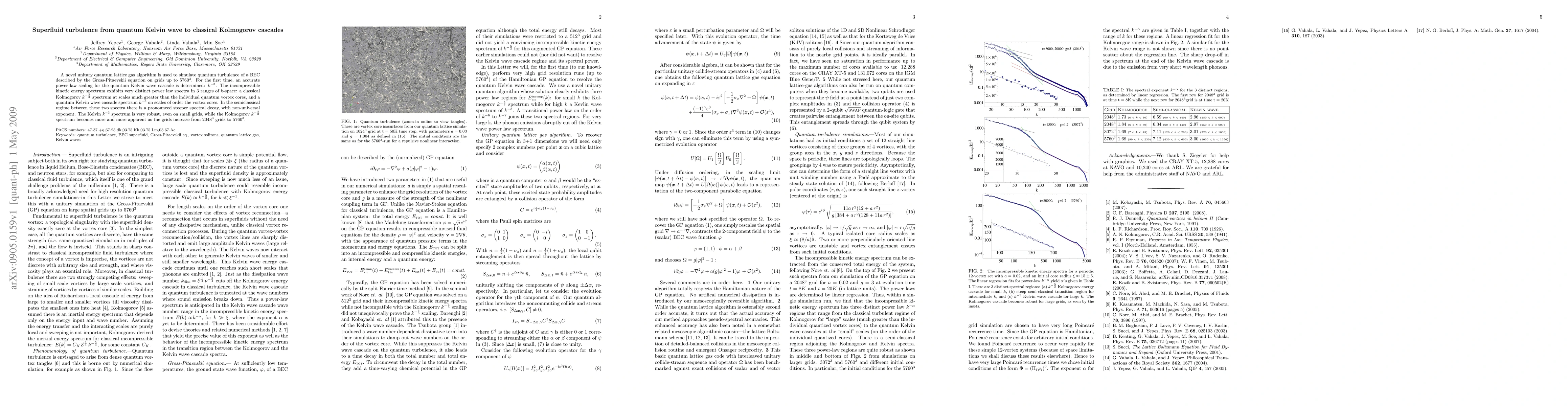 This paper explores superfluid turbulence in a Bose-Einstein condensate using a novel quantum lattice gas algorithm, revealing distinct power law spectra in three k-space ranges: a quantum Kelvin wave cascade (k^{-3}), a classical Kolmogorov cascade (k^{-5/3}), and a semiclassical regime with a steeper spectral decay. The Kelvin wave cascade is robust, while the Kolmogorov spectrum becomes clearer on larger grids.