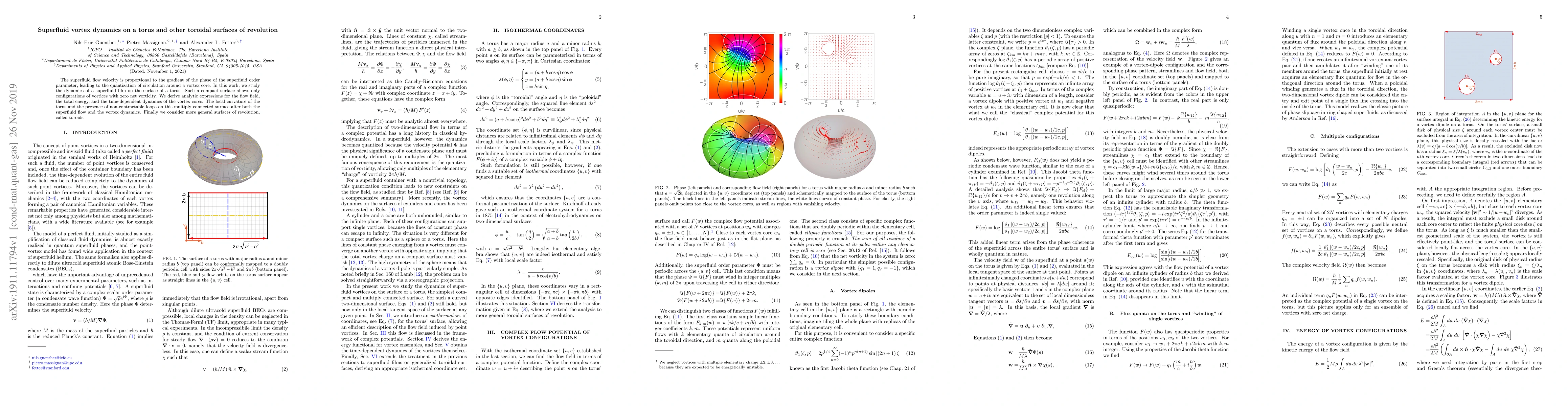 This paper investigates the dynamics of superfluid vortices on toroidal surfaces, deriving analytic expressions for flow field, total energy, and vortex core motion. The unique geometry of the torus and other toroidal surfaces influences the superfluid flow and vortex behavior, leading to zero net vorticity configurations.
