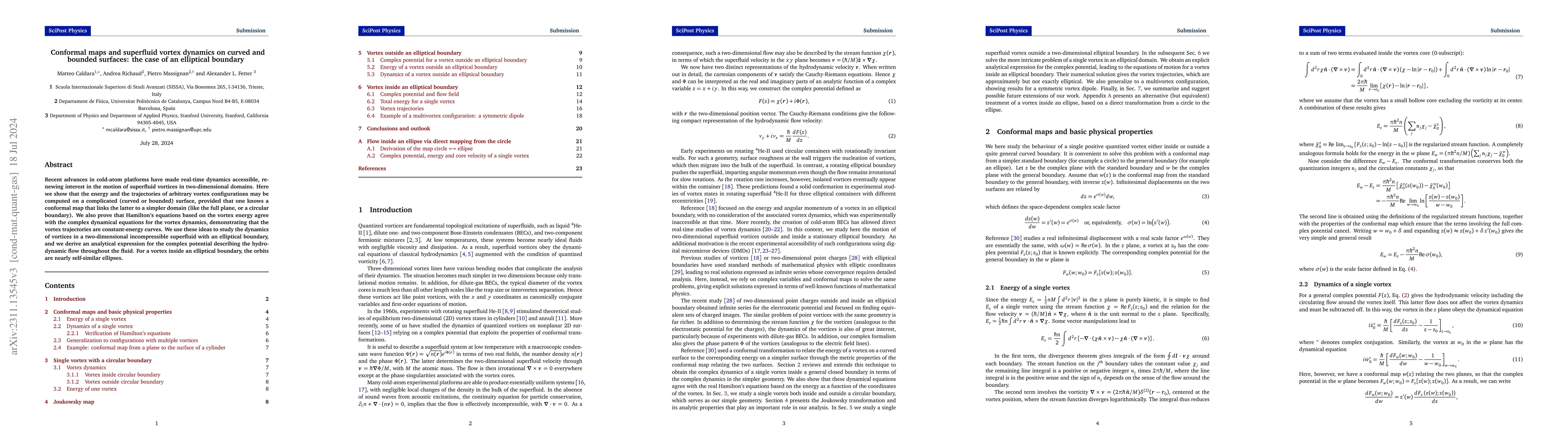 This paper investigates the dynamics of superfluid vortices in elliptically bounded domains using conformal mapping techniques. Analytical expressions for vortex trajectories and hydrodynamic flow are derived, showing nearly self-similar elliptical orbits for vortices.