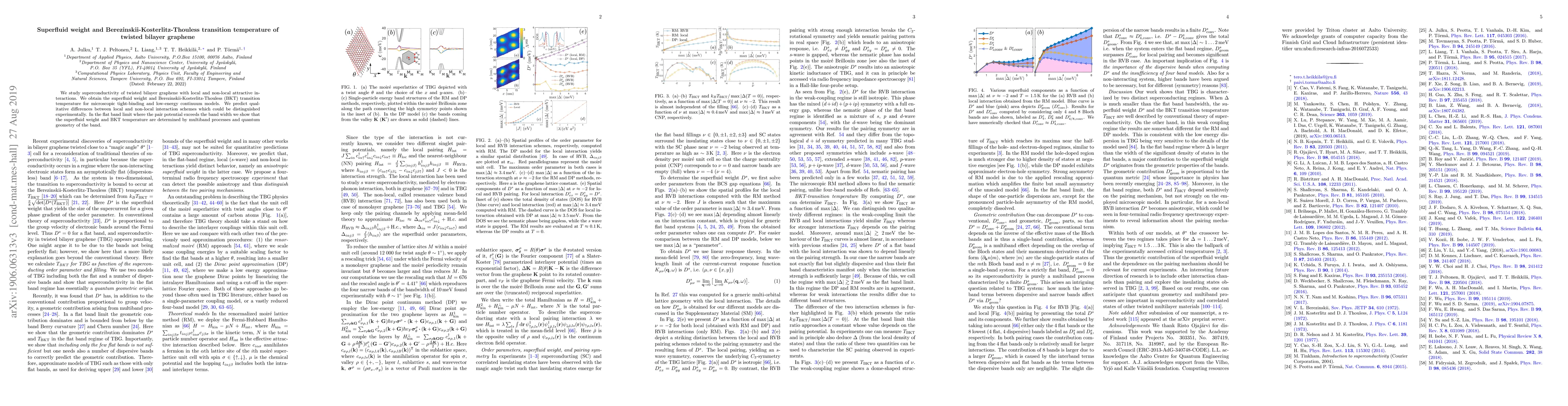 We study superconductivity of twisted bilayer graphene with local and non-local attractive interactions. We obtain the superfluid weight and Berezinskii-Kosterlitz-Thouless (BKT) transition temperature for microscopic tight-binding and low-energy continuum models. We predict qualitative differences between local and non-local interaction schemes which could be distinguished experimentally. In the flat band limit where the pair potential exceeds the band width we show that the superfluid weight and BKT temperature are determined by multiband processes and quantum geometry of the band.
