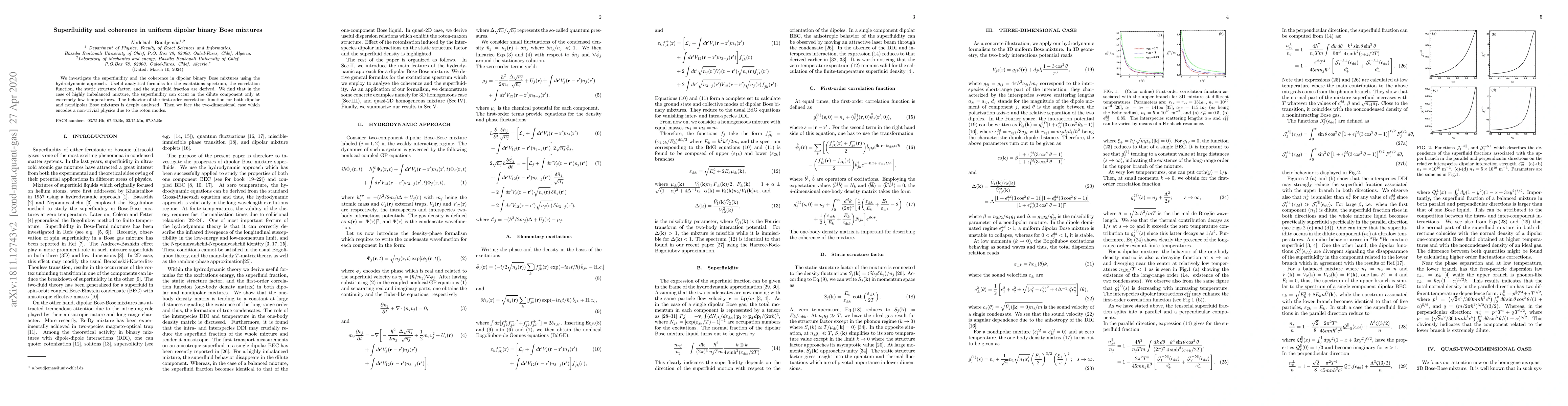 This paper explores superfluidity and coherence in dipolar binary Bose mixtures via hydrodynamics, deriving analytical formulas for key properties. It reveals that superfluidity in highly imbalanced mixtures is limited to the dilute component at very low temperatures, and analyzes the first-order correlation function in both dipolar and nondipolar mixtures, highlighting unique physics in two-dimensional systems with roton modes.