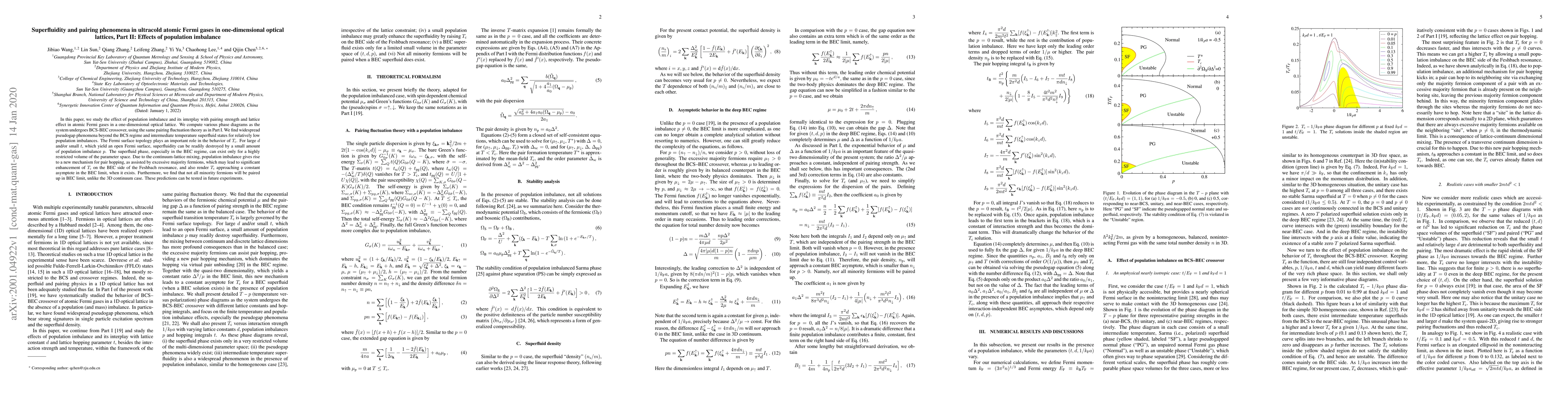 In this paper, we study the effect of population imbalance and its interplay with pairing strength and lattice effect in atomic Fermi gases in a one-dimensional optical lattice. We compute various phase diagrams as the system undergoes BCS-BEC crossover, using the same pairing fluctuation theory as in Part I. We find widespread pseudogap phenomena beyond the BCS regime and intermediate temperature superfluid states for relatively low population imbalances. The Fermi surface topology plays an important role in the behavior of $T_\text{c}$. For large $d$ and/or small $t$, which yield an open Fermi surface, superfluidity can be readily destroyed by a small amount of population imbalance $p$. The superfluid phase, especially in the BEC regime, can exist only for a highly restricted volume of the parameter space. Due to the continuum-lattice mixing, population imbalance gives rise to a new mechanism for pair hopping, as assisted by excessive majority fermions, which may lead to significant enhancement of $T_\text{c}$ on the BEC side of the Feshbach resonance, and also render $T_\text{c}$ approaching a constant asymptote in the BEC limit, when it exists. Furthermore, we find that not all minority fermions will be paired up in BEC limit, unlike the 3D continuum case. These predictions can be tested in future experiments.