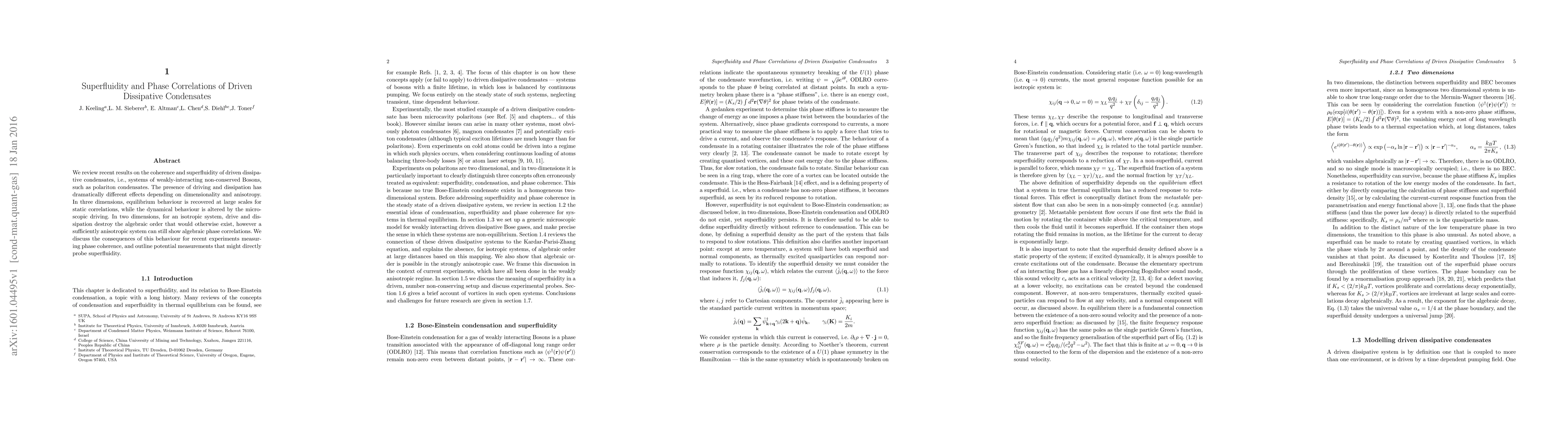 This paper reviews the superfluidity and coherence of driven dissipative condensates, highlighting the impact of dimensionality and anisotropy on their behavior. It finds that while driving and dissipation disrupt order in two-dimensional systems, anisotropic systems can still exhibit algebraic phase correlations, with implications for experimental measurements of phase coherence and superfluidity.