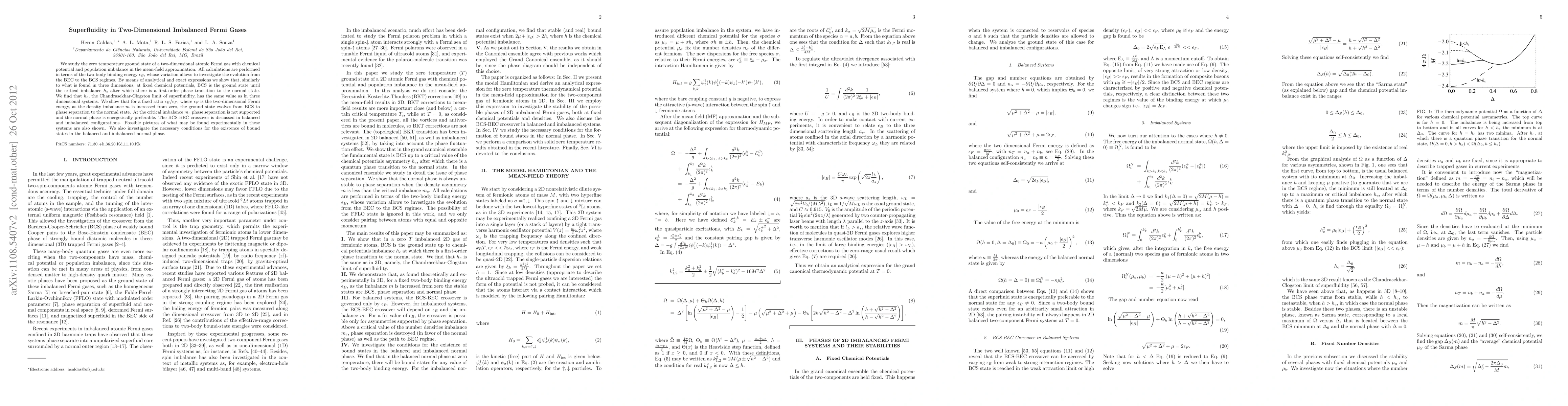 We study the zero temperature ground state of a two-dimensional atomic Fermi gas with chemical potential and population imbalance in the mean-field approximation. All calculations are performed in terms of the two-body binding energy $\epsilon_B$, whose variation allows to investigate the evolution from the BEC to the BCS regimes. By means of analytical and exact expressions we show that, similarly to what is found in three dimensions, at fixed chemical potentials, BCS is the ground state until the critical imbalance $h_c$ after which there is a first-order phase transition to the normal state. We find that $h_c$, the Chandrasekhar-Clogston limit of superfluidity, has the same value as in three dimensional systems. We show that for a fixed ratio $\epsilon_B/\epsilon_F$, where $\epsilon_F$ is the two-dimensional Fermi energy, as the density imbalance $m$ is increased from zero, the ground state evolves from BCS to phase separation to the normal state. At the critical imbalance $m_c$ phase separation is not supported and the normal phase is energetically preferable. The BCS-BEC crossover is discussed in balanced and imbalanced configurations. Possible pictures of what may be found experimentally in these systems are also shown. We also investigate the necessary conditions for the existence of bound states in the balanced and imbalanced normal phase.