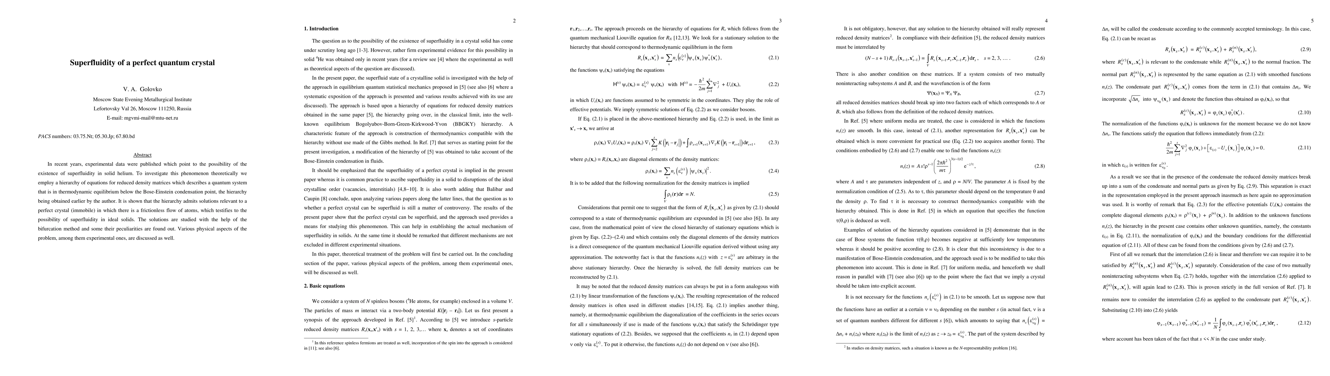 In recent years, experimental data were published which point to the possibility of the existence of superfluidity in solid helium. To investigate this phenomenon theoretically we employ a hierarchy of equations for reduced density matrices which describes a quantum system that is in thermodynamic equilibrium below the Bose-Einstein condensation point, the hierarchy being obtained earlier by the author. It is shown that the hierarchy admits solutions relevant to a perfect crystal (immobile) in which there is a frictionless flow of atoms, which testifies to the possibility of superfluidity in ideal solids. The solutions are studied with the help of the bifurcation method and some their peculiarities are found out. Various physical aspects of the problem, among them experimental ones, are discussed as well.
