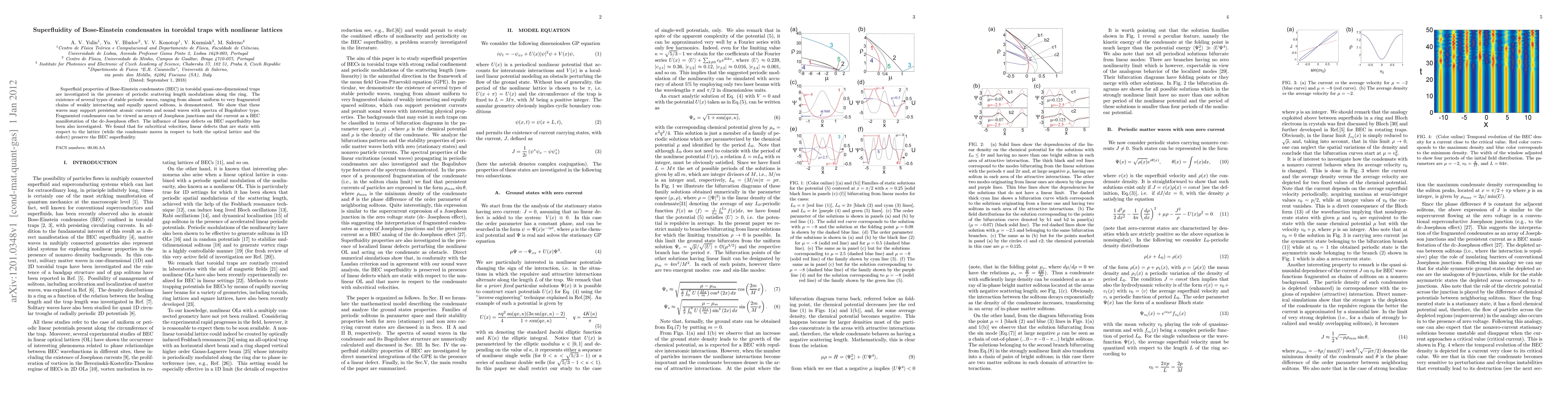 Superfluid properties of Bose-Einstein condensates (BEC) in toroidal quasi-one-dimensional traps are investigated in the presence of periodic scattering length modulations along the ring. The existence of several types of stable periodic waves, ranging from almost uniform to very fragmented chains of weakly interacting and equally spaced solitons, is demonstrated. We show that these waves may support persistent atomic currents and sound waves with spectra of Bogoliubov type. Fragmented condensates can be viewed as arrays of Josephson junctions and the current as a BEC manifestation of the dc-Josephson effect. The influence of linear defects on BEC superfluidity has been also investigated. We found that for subcritical velocities, linear defects that are static with respect to the lattice (while the condensate moves in respect to both the optical lattice and the defect) preserve the BEC superfluidity.