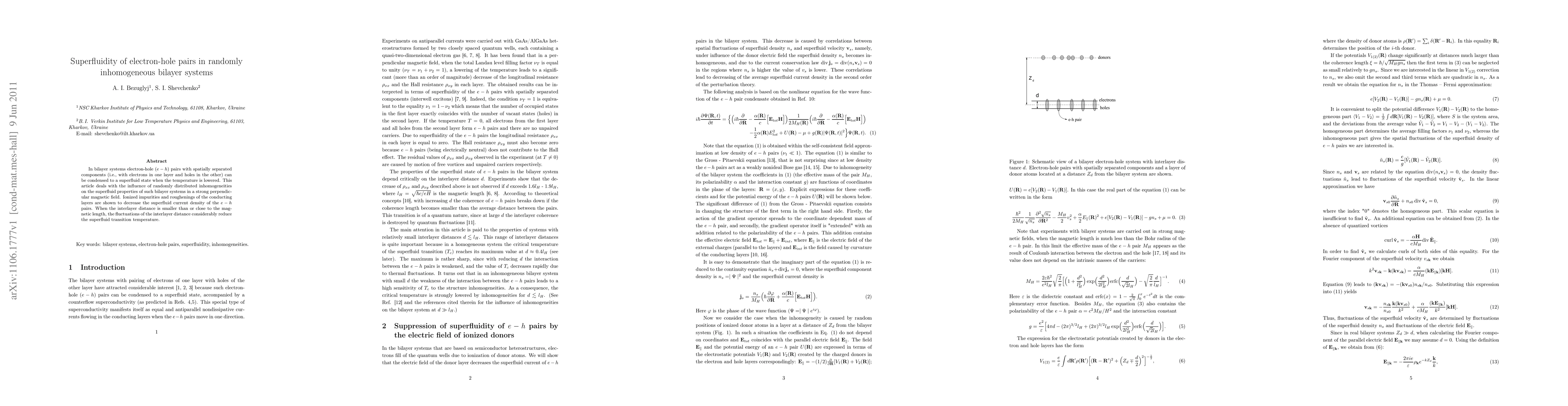 This paper investigates how randomly inhomogeneous features in bilayer systems affect the superfluidity of electron-hole pairs under a strong magnetic field, finding that impurities and layer roughness reduce superfluid current density, while fluctuations in interlayer distance lower the superfluid transition temperature when the interlayer distance is comparable to the magnetic length.