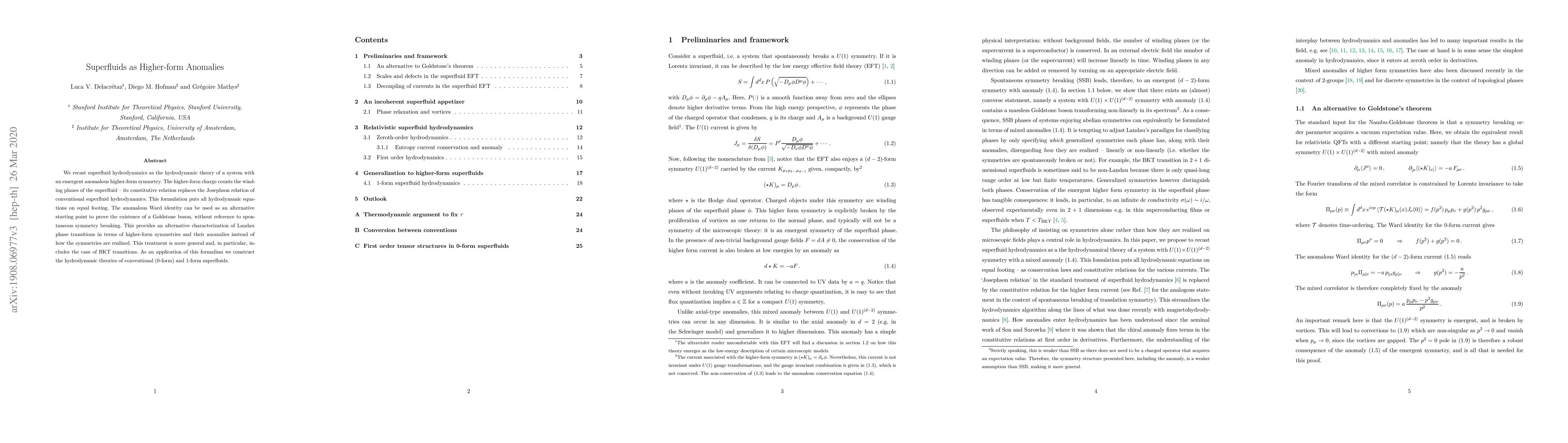 We recast superfluid hydrodynamics as the hydrodynamic theory of a system with an emergent anomalous higher-form symmetry. The higher-form charge counts the winding planes of the superfluid -- its constitutive relation replaces the Josephson relation of conventional superfluid hydrodynamics. This formulation puts all hydrodynamic equations on equal footing. The anomalous Ward identity can be used as an alternative starting point to prove the existence of a Goldstone boson, without reference to spontaneous symmetry breaking. This provides an alternative characterization of Landau phase transitions in terms of higher-form symmetries and their anomalies instead of how the symmetries are realized. This treatment is more general and, in particular, includes the case of BKT transitions. As an application of this formalism we construct the hydrodynamic theories of conventional (0-form) and 1-form superfluids.
