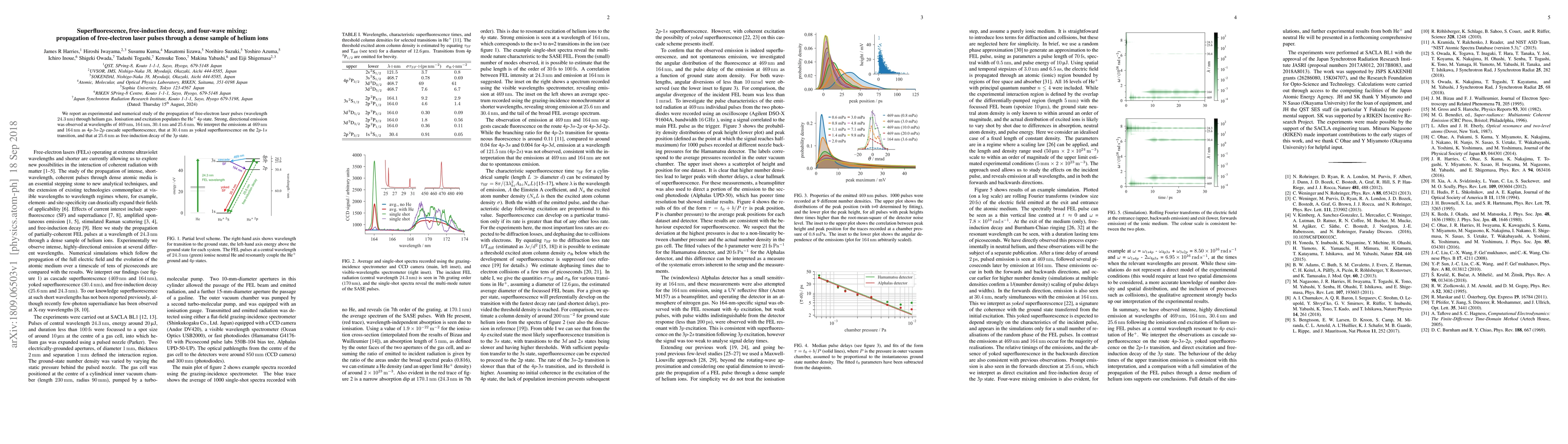 Researchers studied the propagation of free-electron laser pulses through helium gas, detecting strong emissions at multiple wavelengths due to ionization and superfluorescence processes.