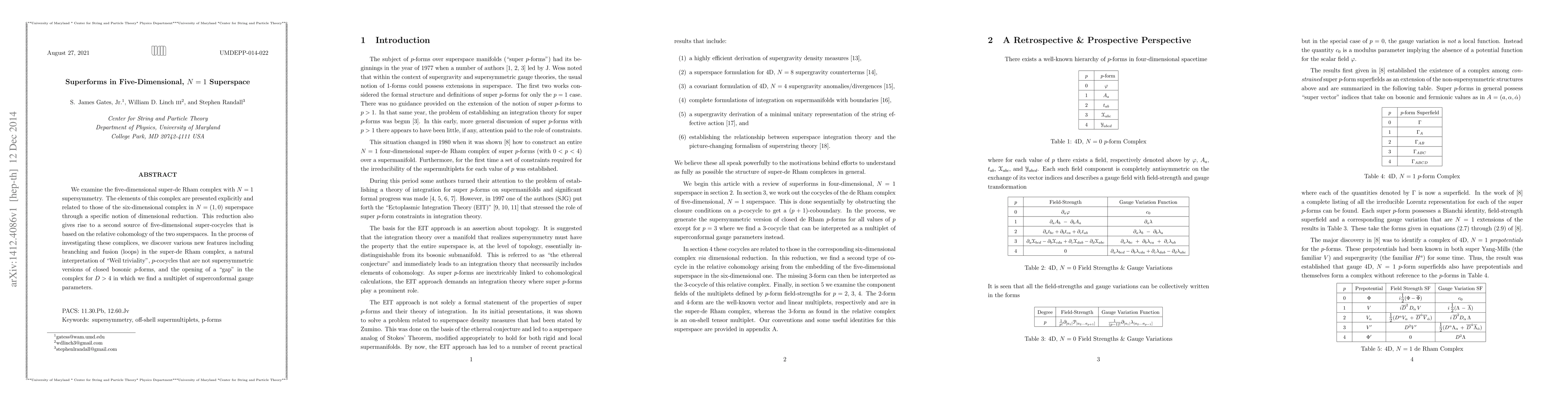 This research explores the five-dimensional super-de Rham complex under $N = 1$ supersymmetry, linking it to the six-dimensional $N = (1, 0)$ complex via dimensional reduction. It uncovers unique features such as branching, fusion loops, and non-supersymmetric $p$-cocycles, revealing a gap for $D > 4$ housing a superconformal gauge parameters multiplet.