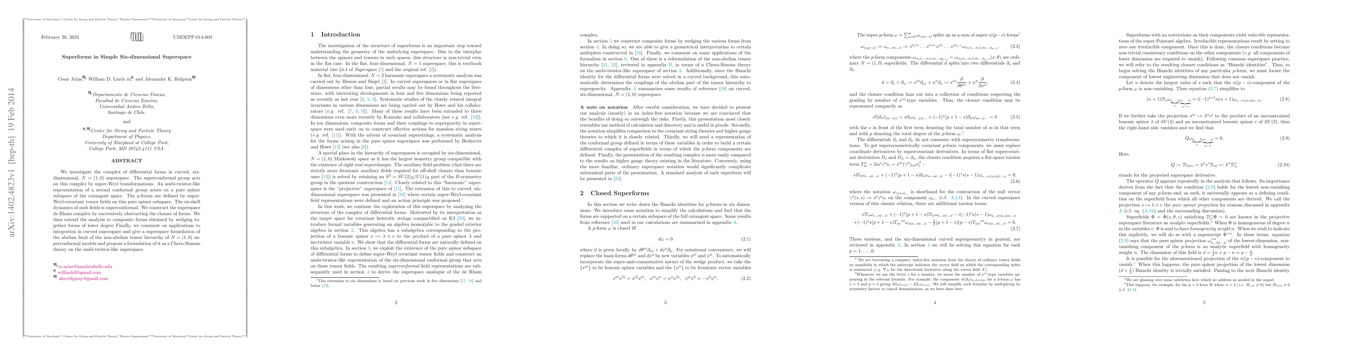 We investigate the complex of differential forms in curved, six-dimensional, $N=(1,0)$ superspace. The superconformal group acts on this complex by super-Weyl transformations. An ambi-twistor-like representation of a second conformal group arises on a pure spinor subspace of the cotangent space. The $p$-forms are defined by super-Weyl-covariant tensor fields on this pure spinor subspace. The on-shell dynamics of such fields is superconformal. We construct the superspace de Rham complex by successively obstructing the closure of forms. We then extend the analysis to composite forms obtained by wedging together forms of lower degree Finally, we comment on applications to integration in curved superspace and give a superspace formulation of the abelian limit of the non-abelian tensor hierarchy of $N=(1,0)$ superconformal models and propose a formulation of it as a Chern-Simons theory on the ambi-twistor-like superspace.