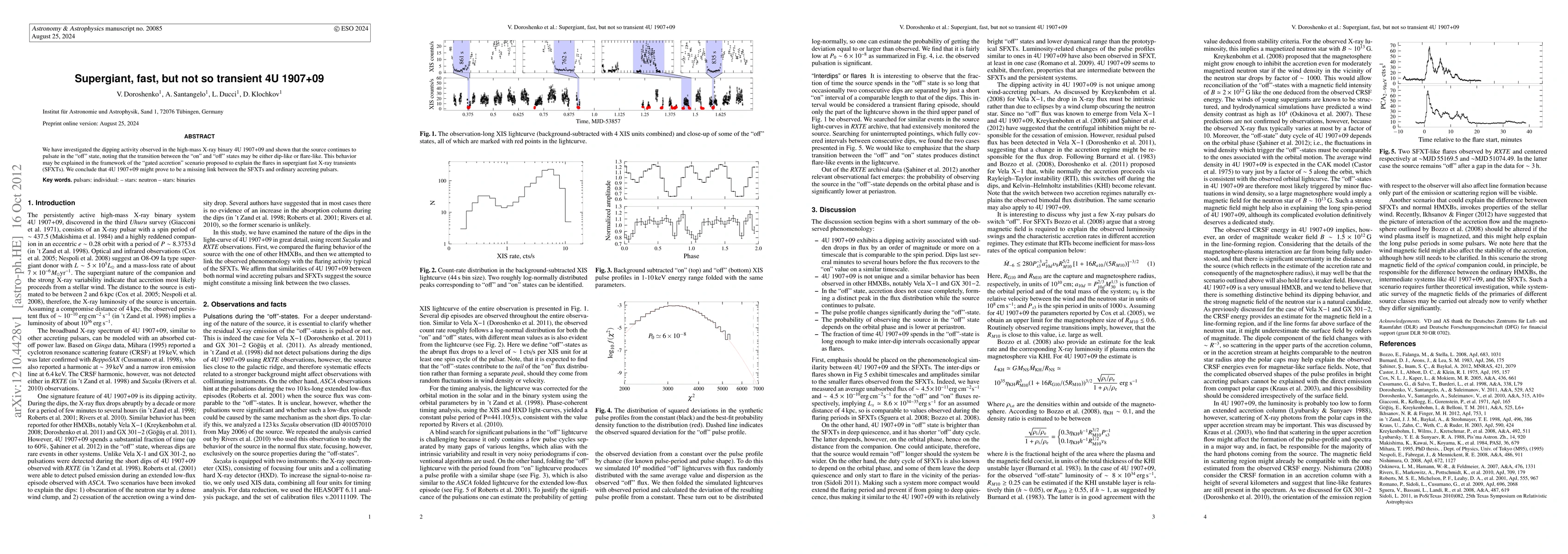 This research offers a novel perspective on the dipping activity in 4U 1907+09, suggesting it may represent a transitional class between SFXTs and ordinary accreting pulsars, based on observed pulsations during 'off' states.