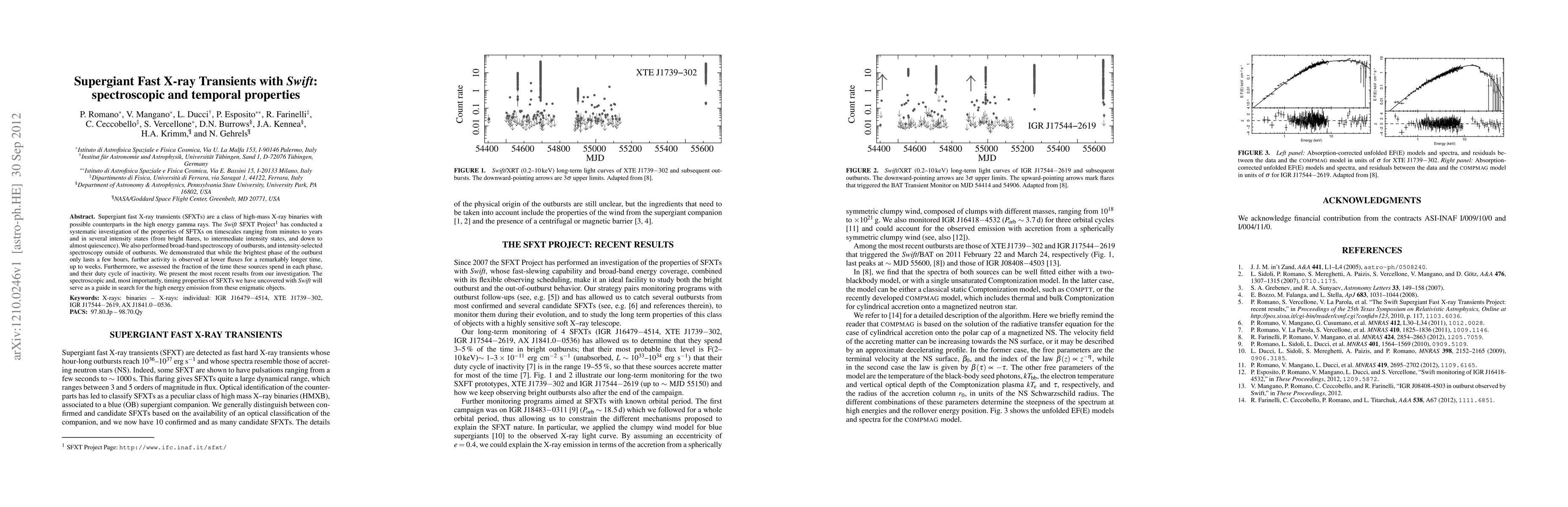 Supergiant fast X-ray transients (SFXTs) are a class of high-mass X-ray binaries with possible counterparts in the high energy gamma rays. The Swift SFXT Project has conducted a systematic investigation of the properties of SFTXs on timescales ranging from minutes to years and in several intensity states (from bright flares, to intermediate intensity states, and down to almost quiescence). We also performed broad-band spectroscopy of outbursts, and intensity-selected spectroscopy outside of outbursts. We demonstrated that while the brightest phase of the outburst only lasts a few hours, further activity is observed at lower fluxes for a remarkably longer time, up to weeks. Furthermore, we assessed the fraction of the time these sources spend in each phase, and their duty cycle of inactivity. We present the most recent results from our investigation. The spectroscopic and, most importantly, timing properties of SFXTs we have uncovered with Swift will serve as a guide in search for the high energy emission from these enigmatic objects.