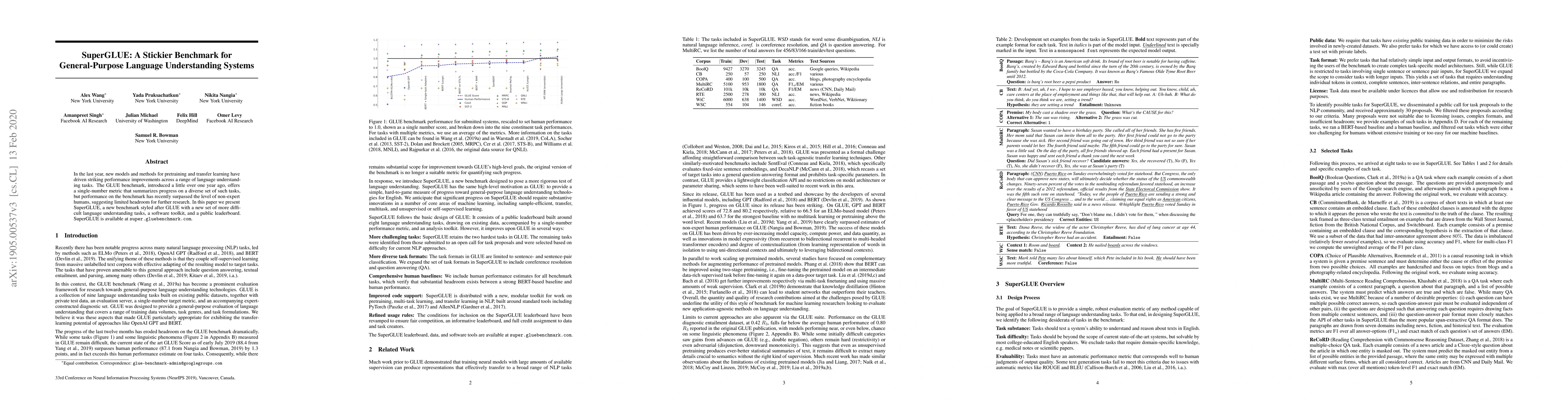 In the last year, new models and methods for pretraining and transfer learning have driven striking performance improvements across a range of language understanding tasks. The GLUE benchmark, introduced a little over one year ago, offers a single-number metric that summarizes progress on a diverse set of such tasks, but performance on the benchmark has recently surpassed the level of non-expert humans, suggesting limited headroom for further research. In this paper we present SuperGLUE, a new benchmark styled after GLUE with a new set of more difficult language understanding tasks, a software toolkit, and a public leaderboard. SuperGLUE is available at super.gluebenchmark.com.