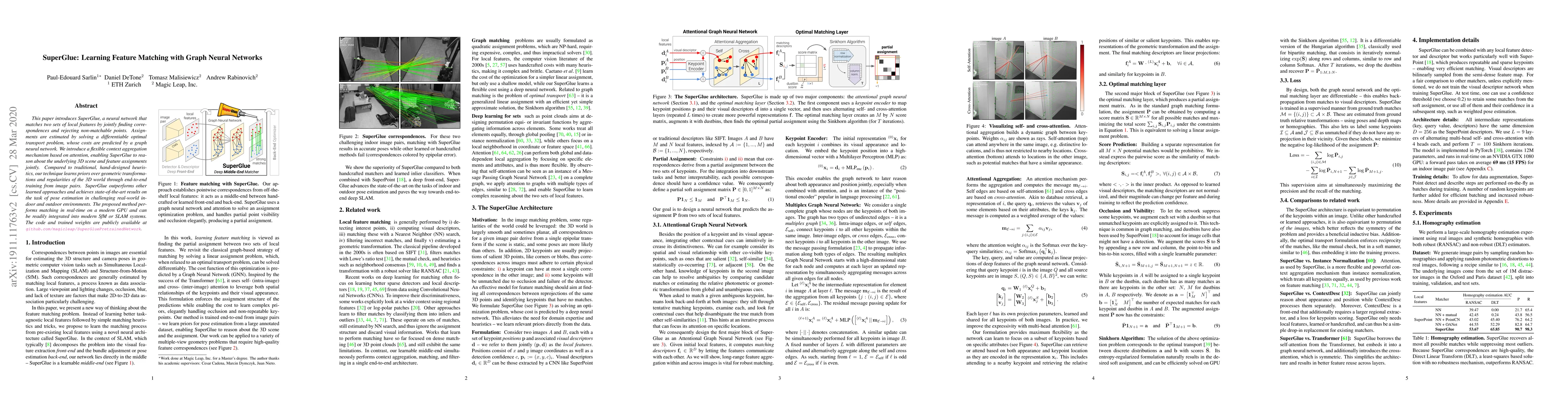 This paper introduces SuperGlue, a neural network that matches two sets of local features by jointly finding correspondences and rejecting non-matchable points. Assignments are estimated by solving a differentiable optimal transport problem, whose costs are predicted by a graph neural network. We introduce a flexible context aggregation mechanism based on attention, enabling SuperGlue to reason about the underlying 3D scene and feature assignments jointly. Compared to traditional, hand-designed heuristics, our technique learns priors over geometric transformations and regularities of the 3D world through end-to-end training from image pairs. SuperGlue outperforms other learned approaches and achieves state-of-the-art results on the task of pose estimation in challenging real-world indoor and outdoor environments. The proposed method performs matching in real-time on a modern GPU and can be readily integrated into modern SfM or SLAM systems. The code and trained weights are publicly available at https://github.com/magicleap/SuperGluePretrainedNetwork.