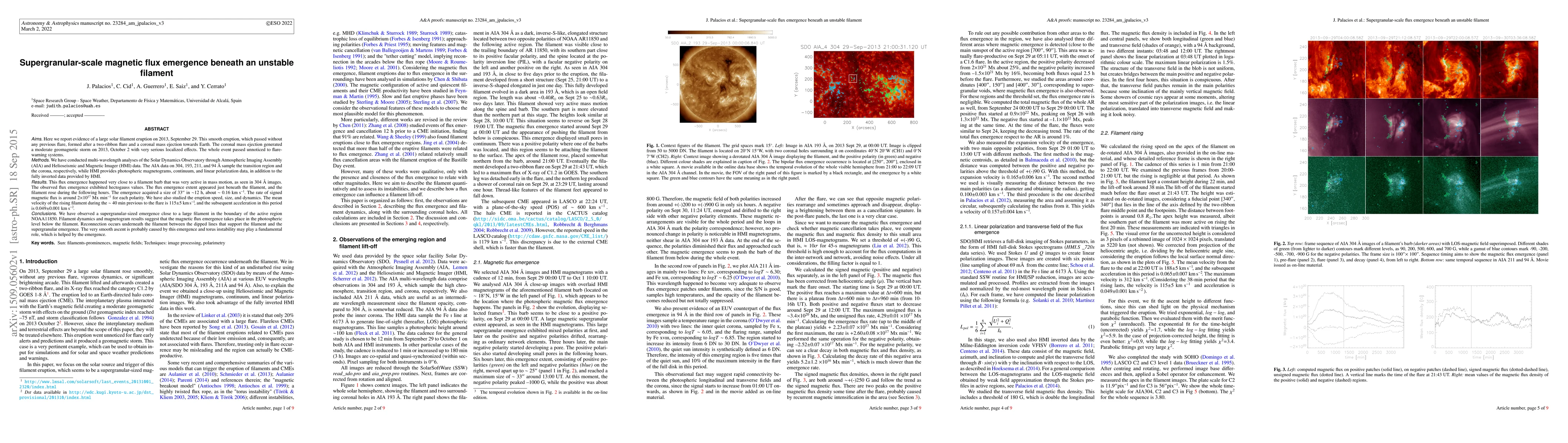Here we report evidence of a large solar filament eruption on 2013, September 29. This smooth eruption, which passed without any previous flare, formed after a two-ribbon flare and a coronal mass ejection towards Earth. The coronal mass ejection generated a moderate geomagnetic storm on 2013, October 2 with very serious localized effects. The whole event passed unnoticed to flare-warning systems. We have conducted multi-wavelength analyses of the Solar Dynamics Observatory through Atmospheric Imaging Assembly (AIA) and Helioseismic and Magnetic Imager (HMI) data. The AIA data on 304, 193, 211, and 94 \AA sample the transition region and the corona, respectively, while HMI provides photospheric magnetograms, continuum, and linear polarization data, in addition to the fully inverted data provided by HMI. [...] We have observed a supergranular-sized emergence close to a large filament in the boundary of the active region NOAA11850. Filament dynamics and magnetogram results suggest that the magnetic flux emergence takes place in the photospheric level below the filament. Reconnection occurs underneath the filament between the dipped lines that support the filament and the supergranular emergence. The very smooth ascent is probably caused by this emergence and torus instability may play a fundamental role, which is helped by the emergence.