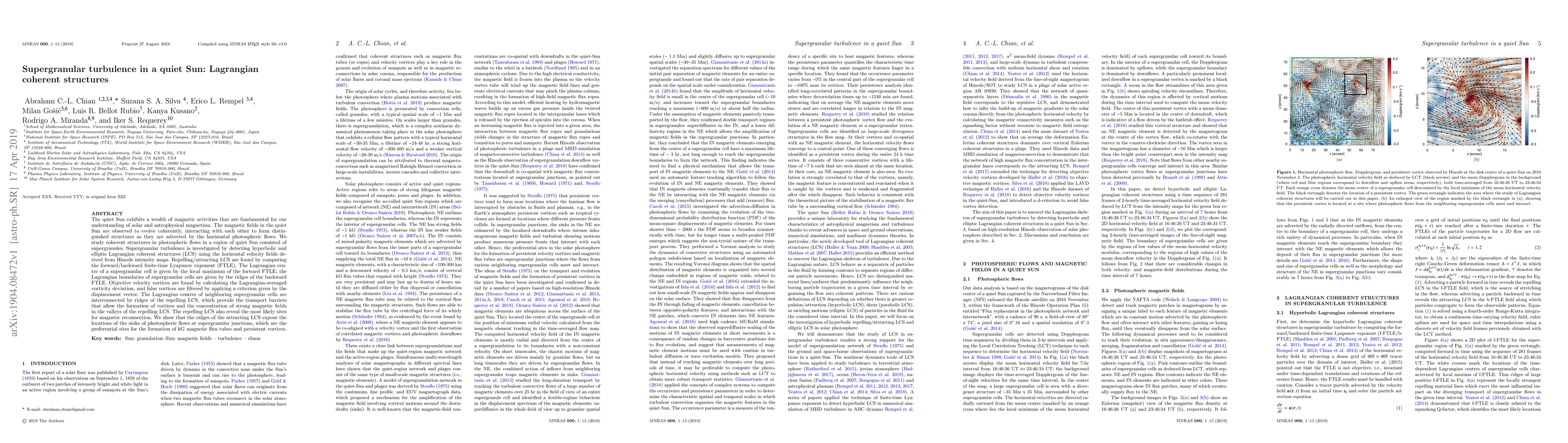This paper investigates supergranular turbulence in the quiet Sun by identifying Lagrangian coherent structures (LCS) in photospheric flows, revealing transport barriers and sites for magnetic reconnection and flux tube formation using finite-time Lyapunov exponents and velocity fields from Hinode observations.