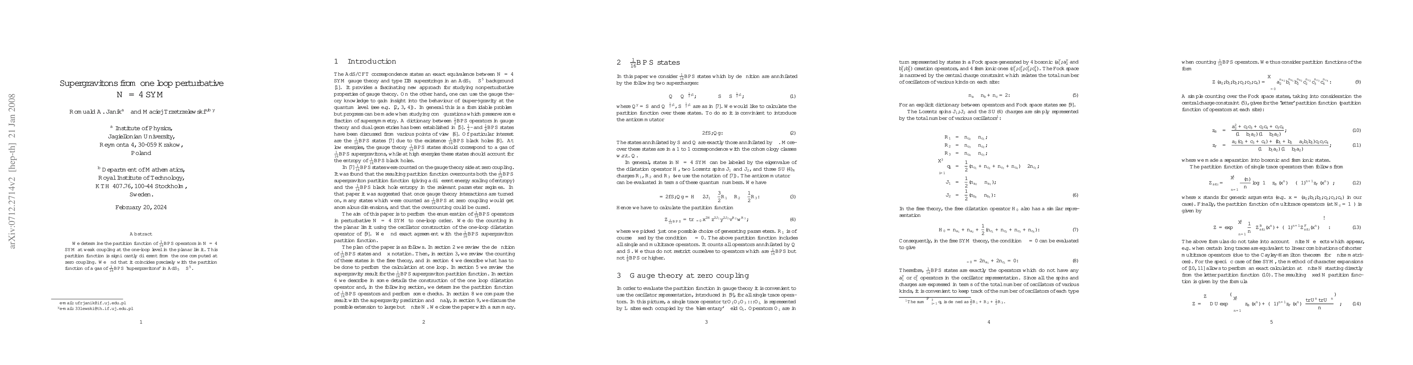 This paper computes the one-loop partition function of 1/16 BPS operators in N=4 Super Yang-Mills theory at weak coupling, revealing a precise match with the partition function of a gas of 1/16 BPS supergravitons in AdS_5xS^5.