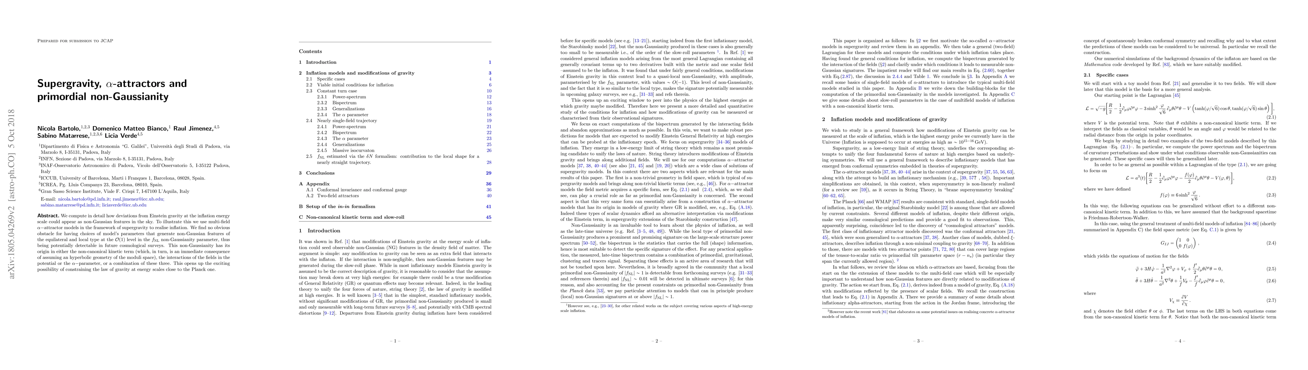 We compute in detail how deviations from Einstein gravity at the inflation energy scale could appear as non-Gaussian features in the sky. To illustrate this we use multi-field $\alpha-$attractor models in the framework of supergravity to realise inflation. We find no obvious obstacle for having choices of model's parameters that generate non-Gaussian features of the equilateral and local type at the $\cal O$(1) level in the $f_{\rm NL}$ non-Gaussianity parameter, thus being potentially detectable in future cosmological surveys. This non-Gaussianity has its origin in either the non-canonical kinetic term (which, in turn, is an immediate consequence of assuming an hyperbolic geometry of the moduli space), the interactions of the fields in the potential or the $\alpha-$parameter, or a combination of these three. This opens up the exciting possibility of constraining the law of gravity at energy scales close to the Planck one.