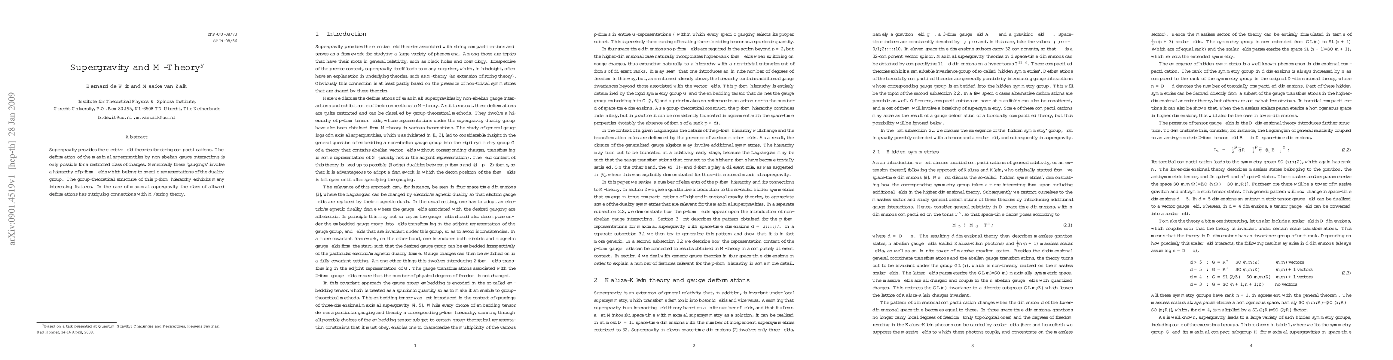 Supergravity serves as the effective field theory for string compactifications, with maximal supergravities admitting deformations through non-abelian gauge interactions. These deformations reveal a hierarchy of p-form fields linked to specific representations of the duality group, with maximal supergravity's allowed deformations showing deep connections to M-theory.