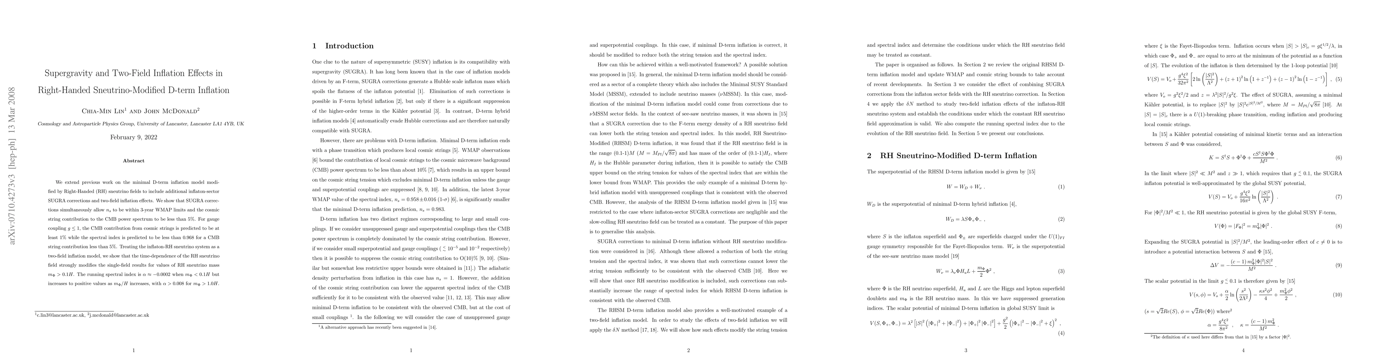 We extend previous work on the minimal D-term inflation model modified by Right-Handed (RH) sneutrino fields to include additional inflaton-sector SUGRA corrections and two-field inflation effects. We show that SUGRA corrections simultaneously allow n_{s} to be within 3-year WMAP limits and the cosmic string contribution to the CMB power spectrum to be less than 5%. For gauge coupling g < 1, the CMB contribution from cosmic strings is predicted to be at least 1% while the spectral index is predicted to be less than 0.968 for a CMB string contribution less than 5%. Treating the inflaton-RH sneutrino system as a two-field inflation model, we show that the time-dependence of the RH sneutrino field strongly modifies the single-field results for values of RH sneutrino mass m_{\Phi} > 0.1 H. The running spectral index is \alpha = -0.0002 when m_{\Phi} < 0.1 H but increases to positive values as m_{\Phi}/H increases, with \alpha > 0.008 for m_{\Phi} > 1.0 H.