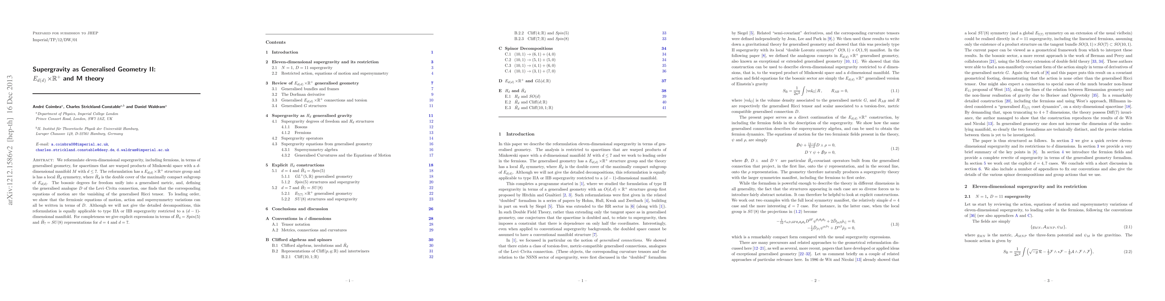 The paper introduces a generalised geometry formulation of eleven-dimensional supergravity, extending the concept to include fermions and warped product spacetimes, with a $E_{d(d)} \times \mathbb{R}^+$ structure group.