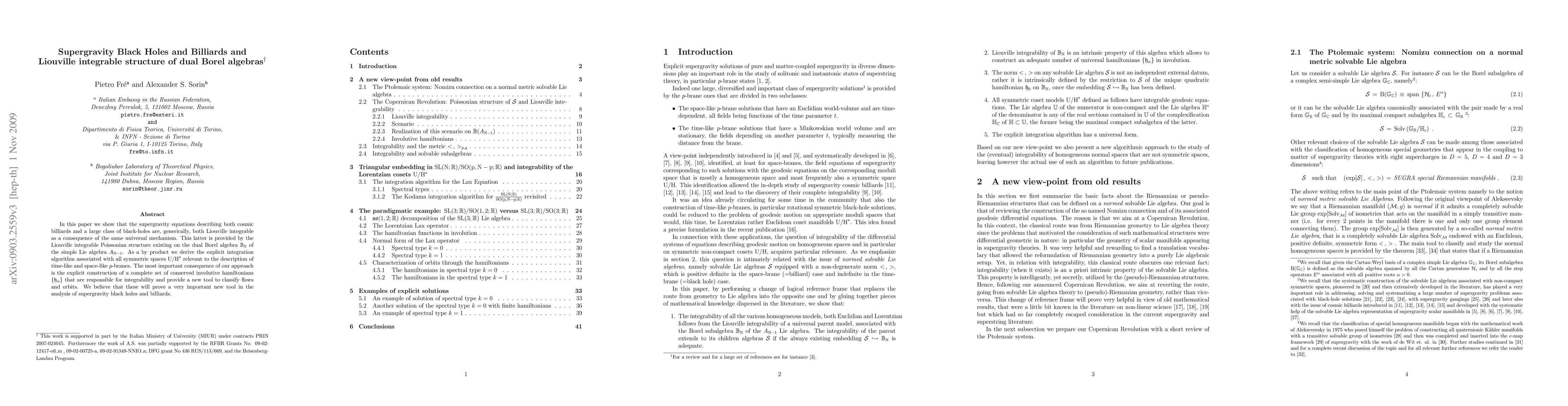 In this paper we show that the supergravity equations describing both cosmic billiards and a large class of black-holes are, generically, both Liouville integrable as a consequence of the same universal mechanism. This latter is provided by the Liouville integrable Poissonian structure existing on the dual Borel algebra B_N of the simple Lie algebra A_{N-1}. As a by product we derive the explicit integration algorithm associated with all symmetric spaces U/H^{*} relevant to the description of time-like and space-like p-branes. The most important consequence of our approach is the explicit construction of a complete set of conserved involutive hamiltonians h_{\alpha} that are responsible for integrability and provide a new tool to classify flows and orbits. We believe that these will prove a very important new tool in the analysis of supergravity black holes and billiards.