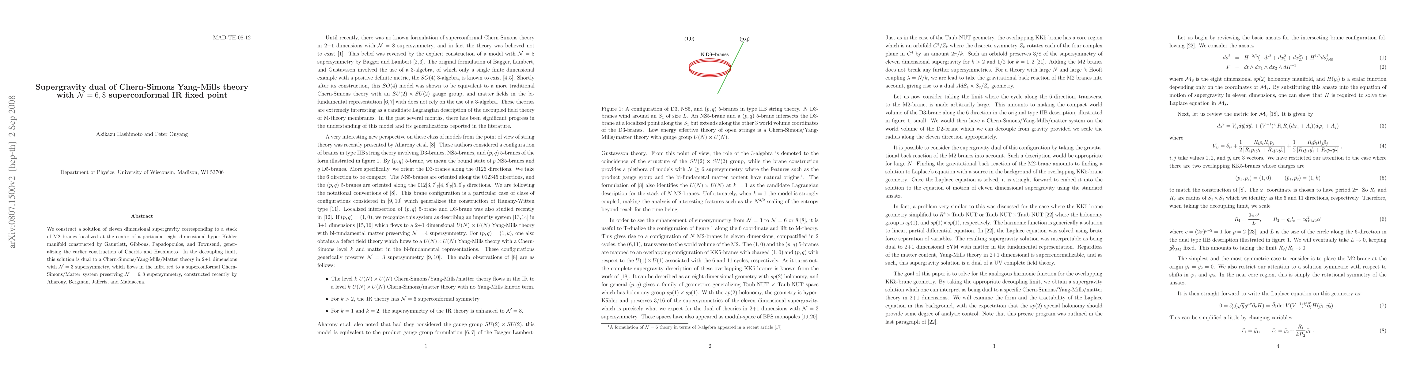 This paper constructs an eleven-dimensional supergravity solution representing M2 branes in a specific eight-dimensional hyper-Kähler manifold, dual to a 2+1 dimensional Chern-Simons/Yang-Mills/Matter theory that flows to an N=6,8 superconformal IR fixed point.